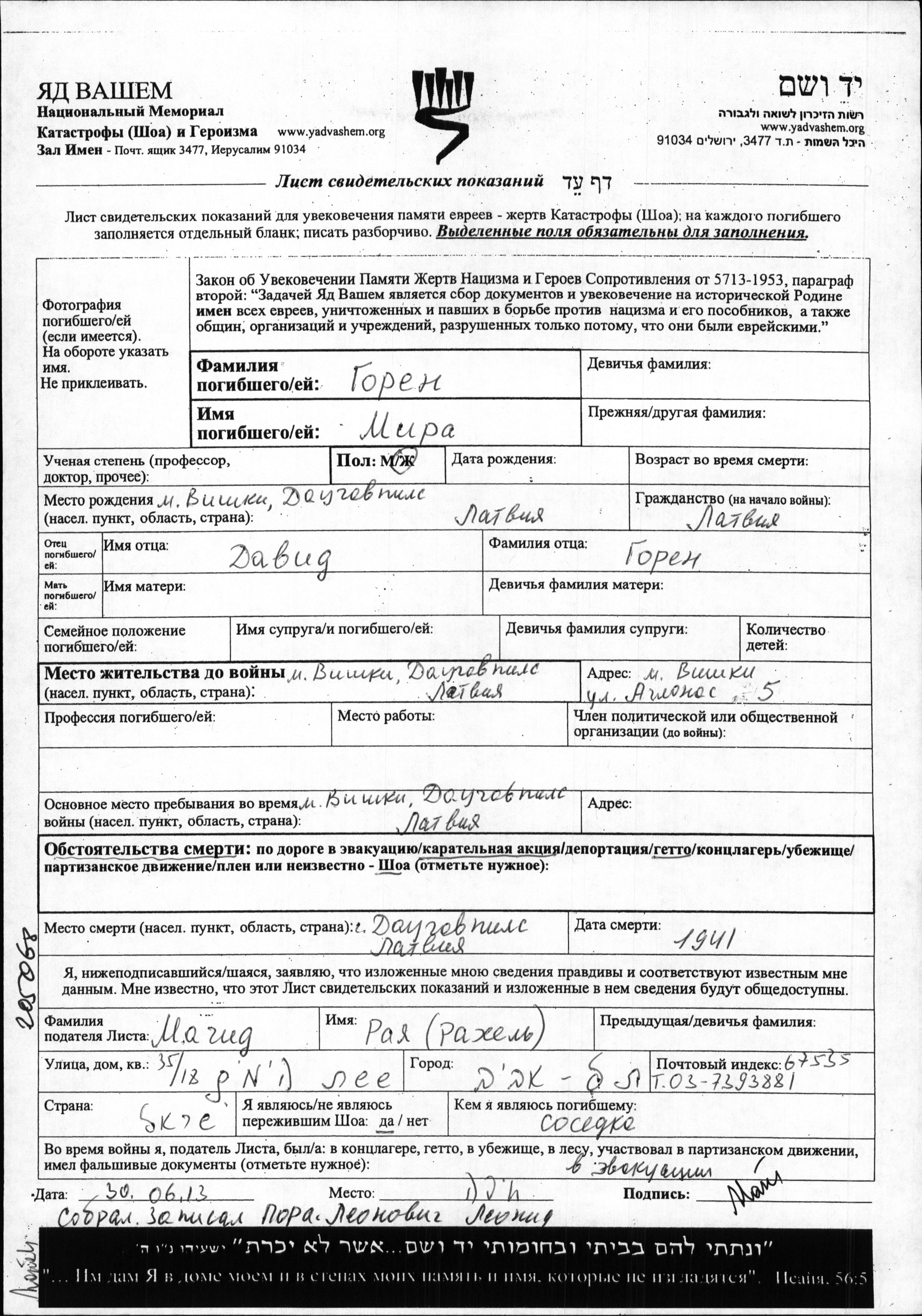 Goren Mira Viski, Lettonie Feuille de témoignage