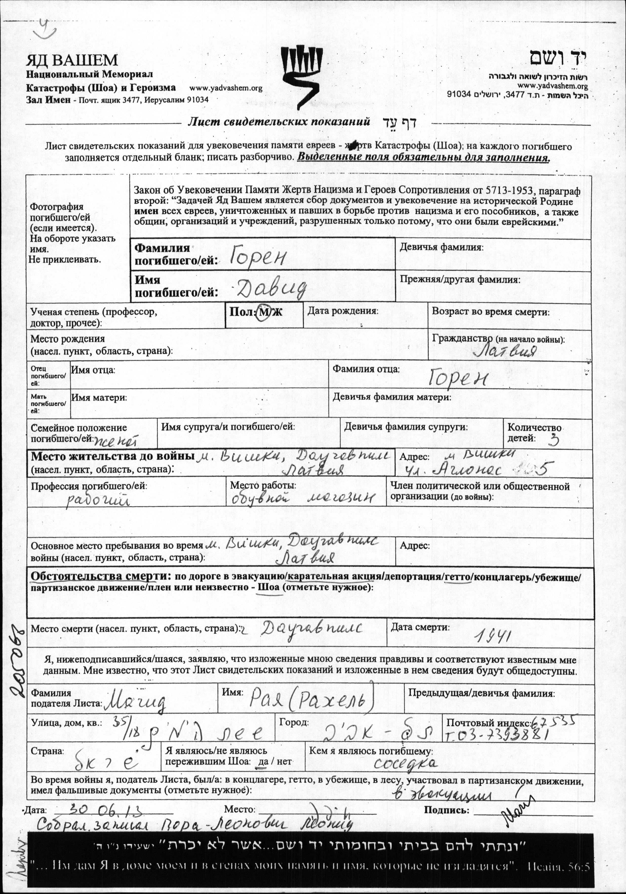 David a été assassiné pendant la Shoah. Lieu de la mort: Daugavpils, Lettonie en 1941.