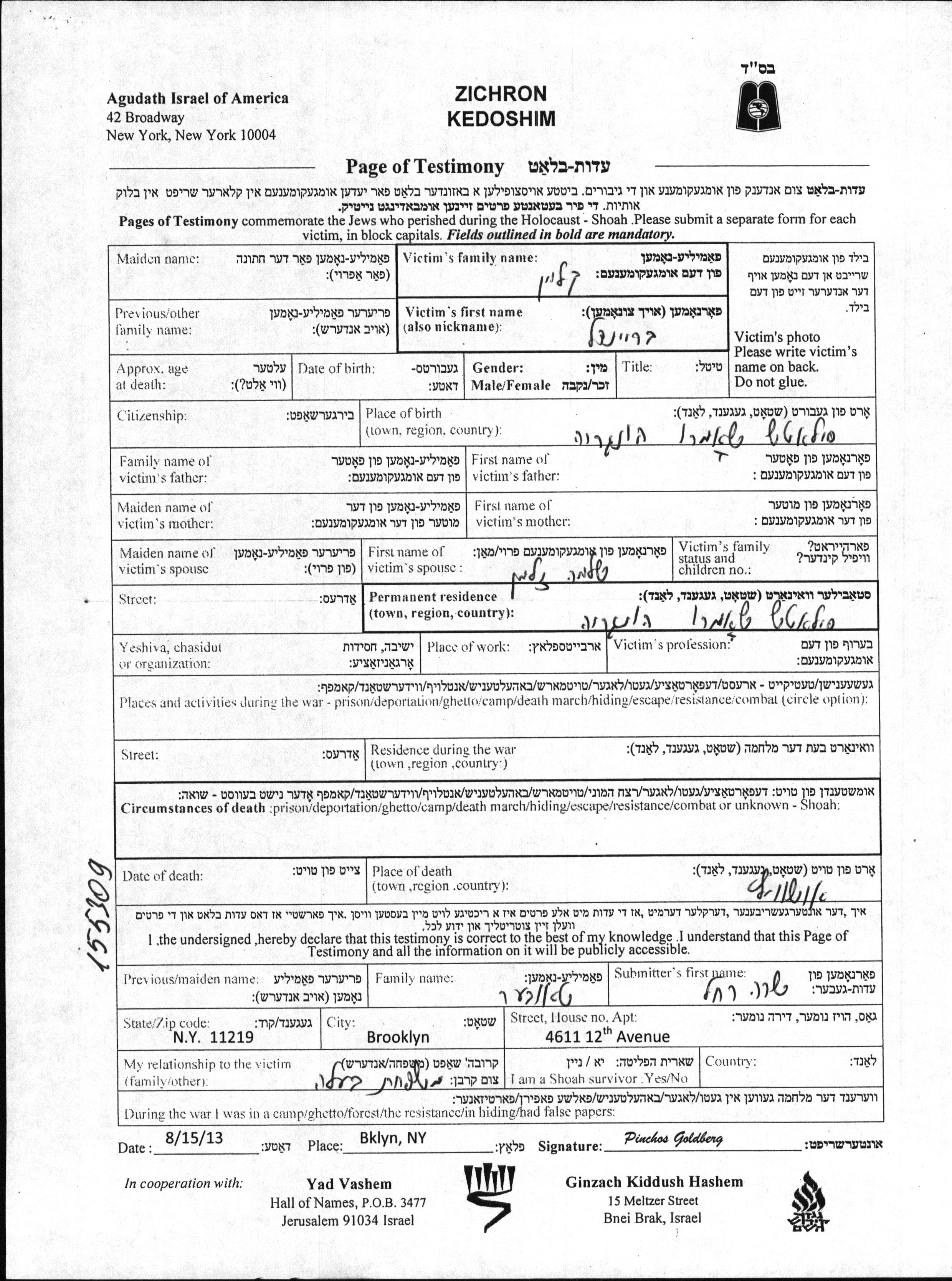 Yad Vashem - Pages of Testimony Names Memorial Collection