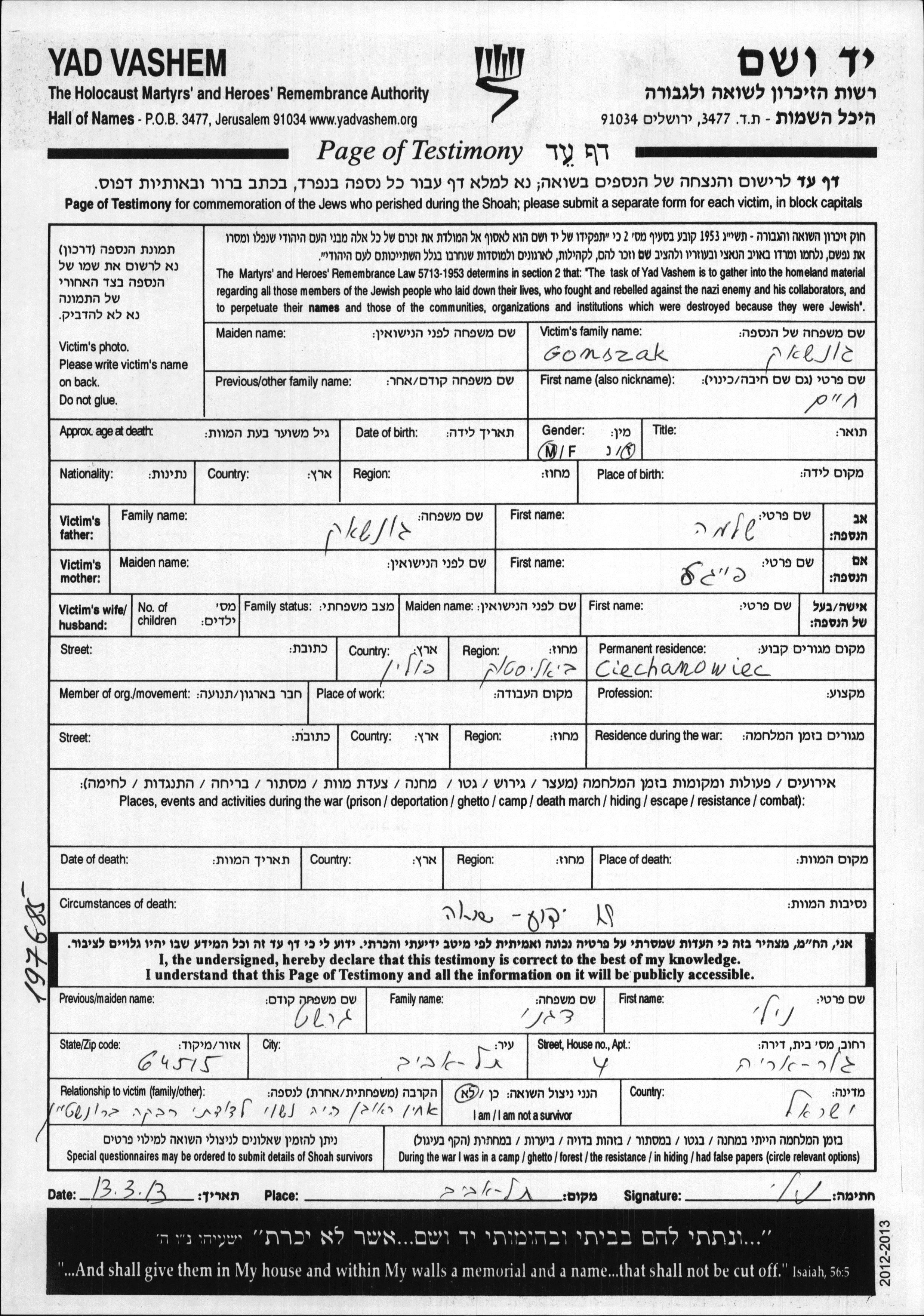 Gonszak Chaim Ciechanowiec, Pologne Feuille de témoignage