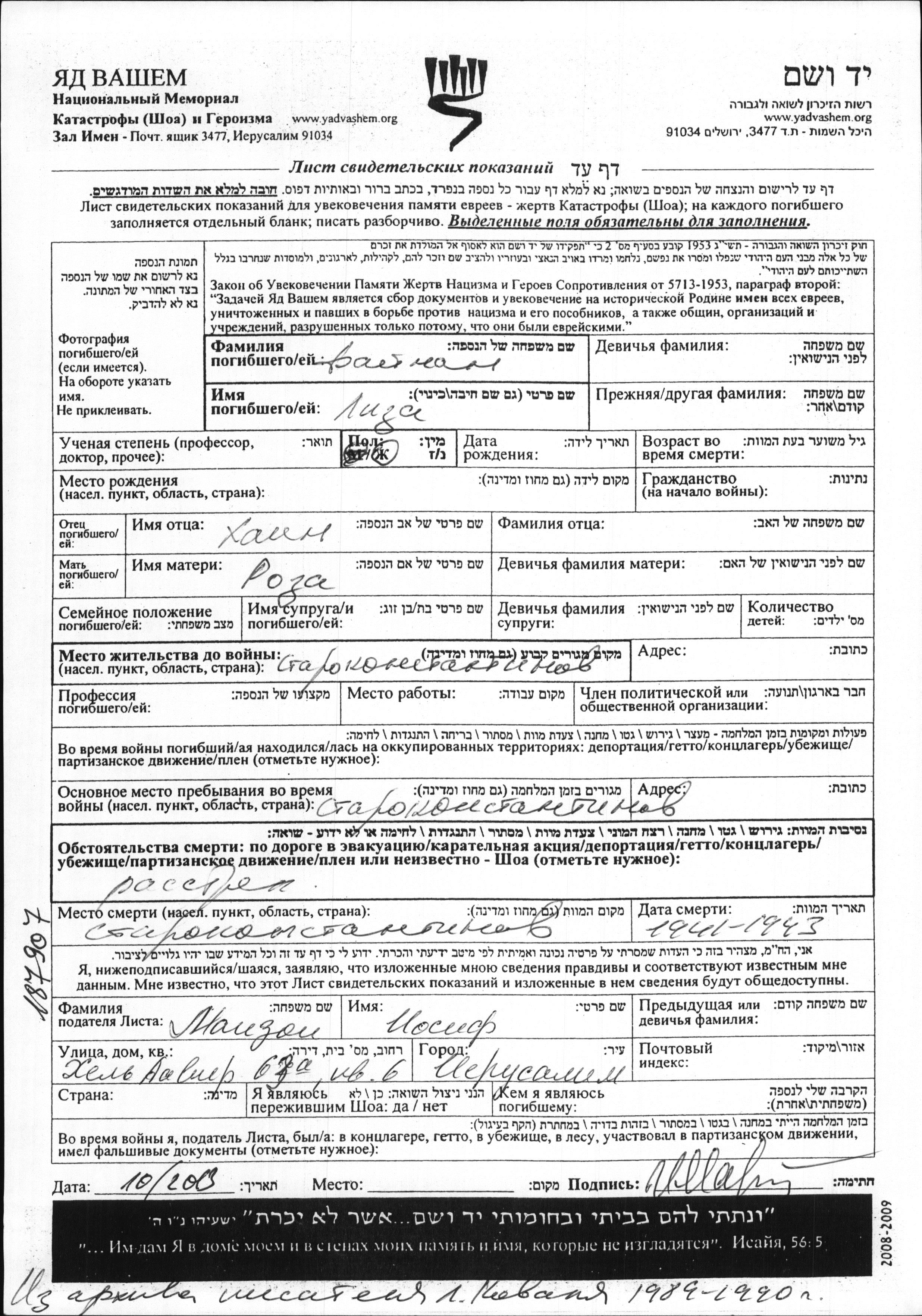 Yad Vashem - Pages of Testimony Names Memorial Collection