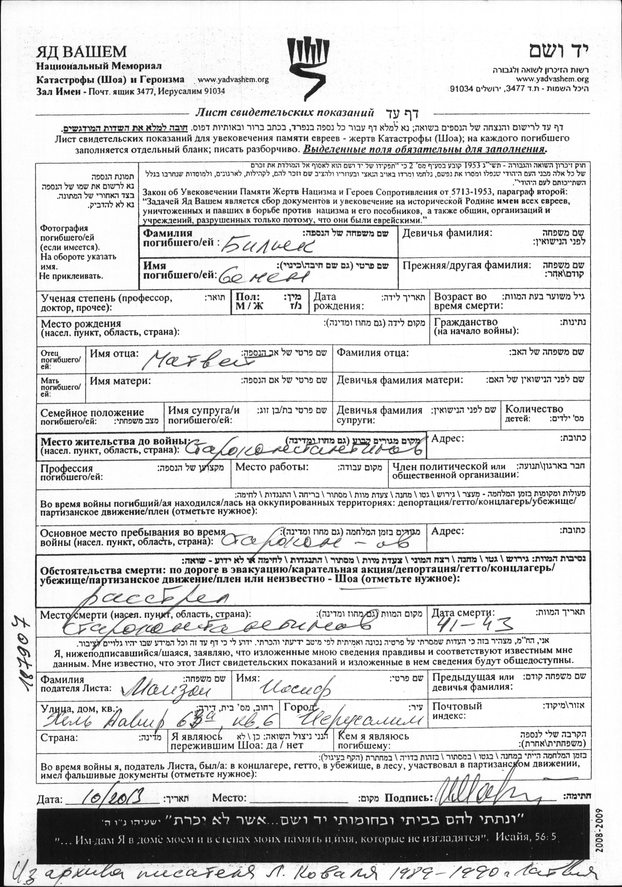 Yad Vashem - Pages of Testimony Names Memorial Collection