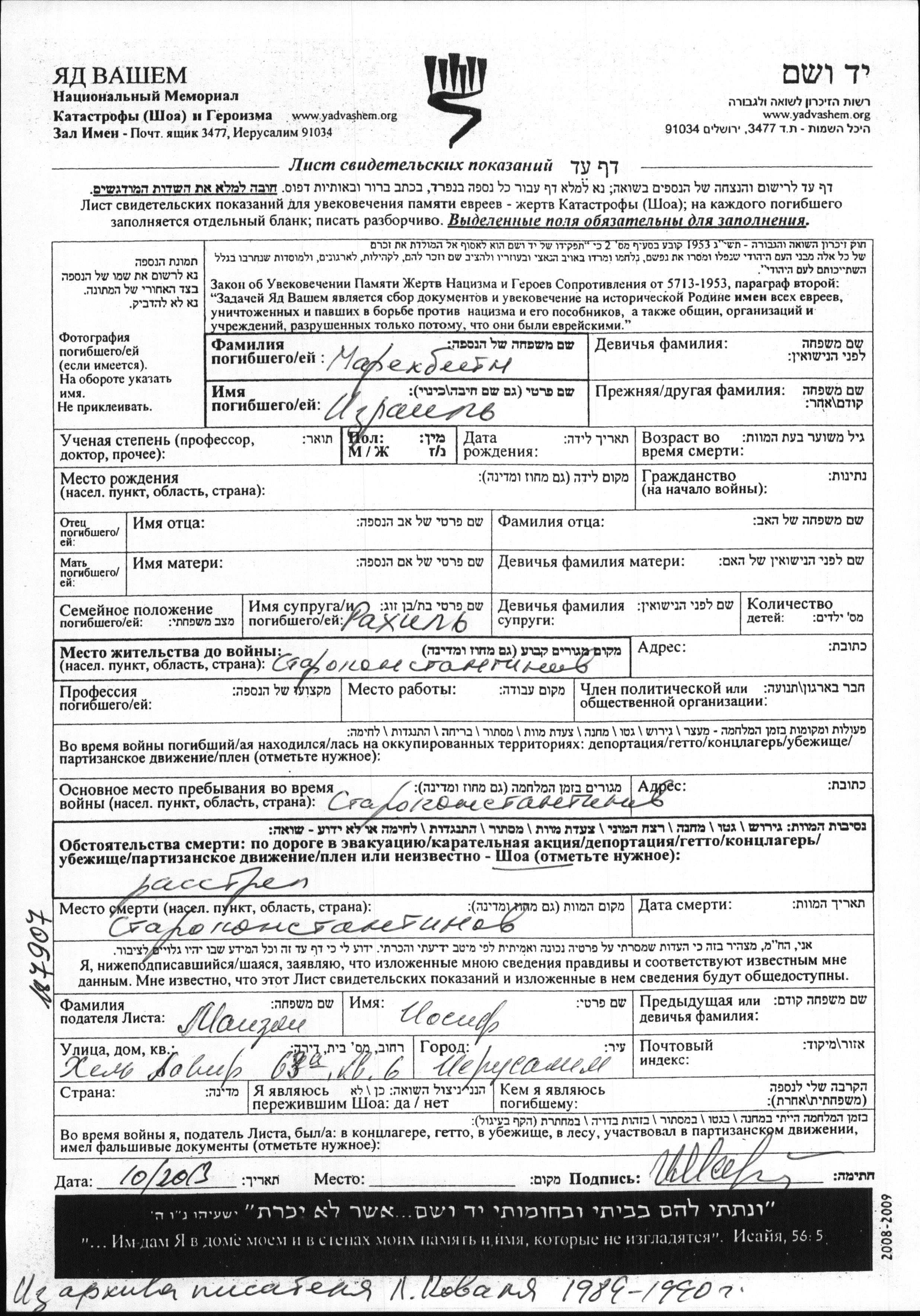 Yad Vashem - Pages of Testimony Names Memorial Collection