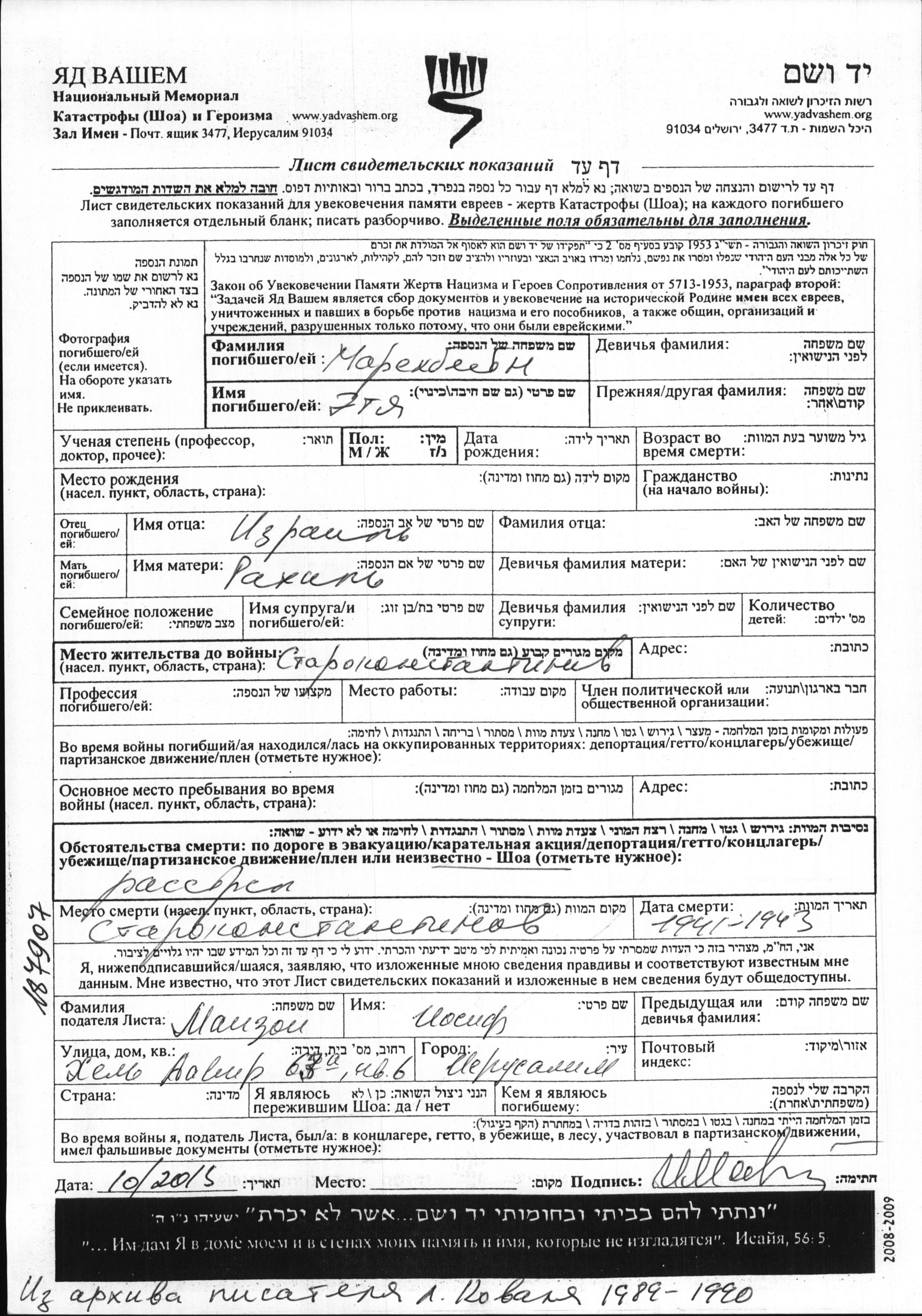 Yad Vashem - Pages of Testimony Names Memorial Collection