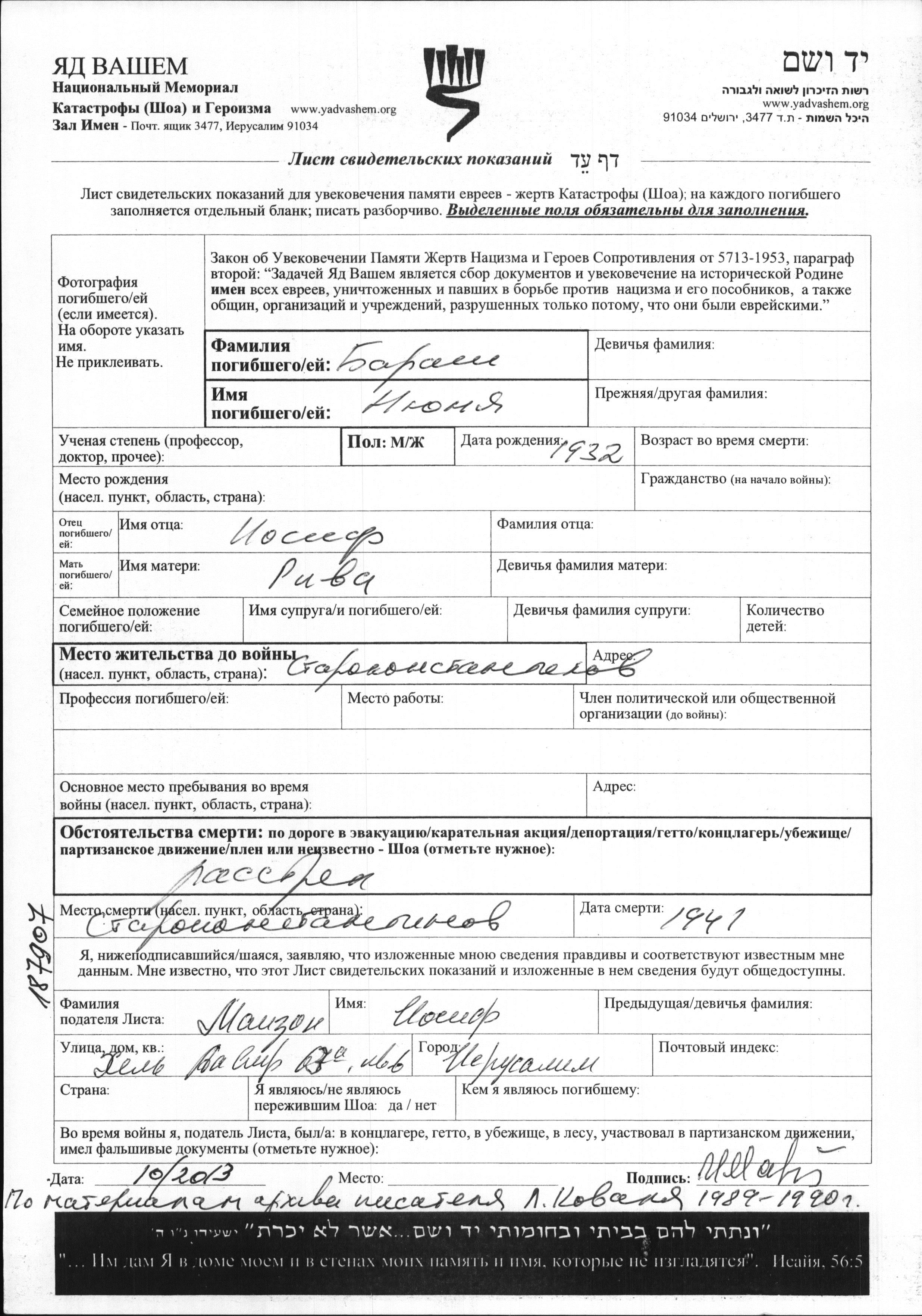 Yad Vashem - Pages of Testimony Names Memorial Collection