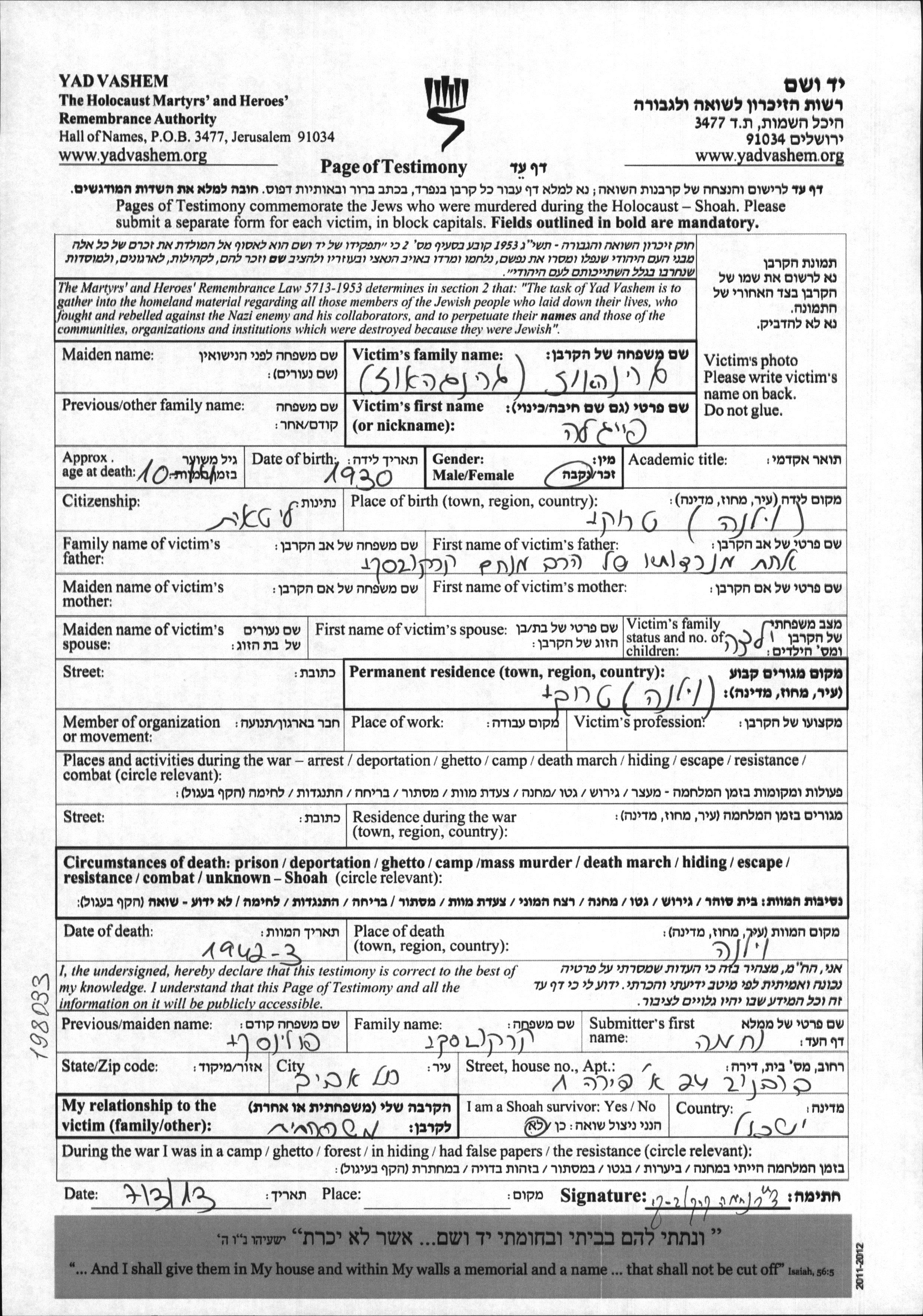 Yad Vashem - Pages of Testimony Names Memorial Collection