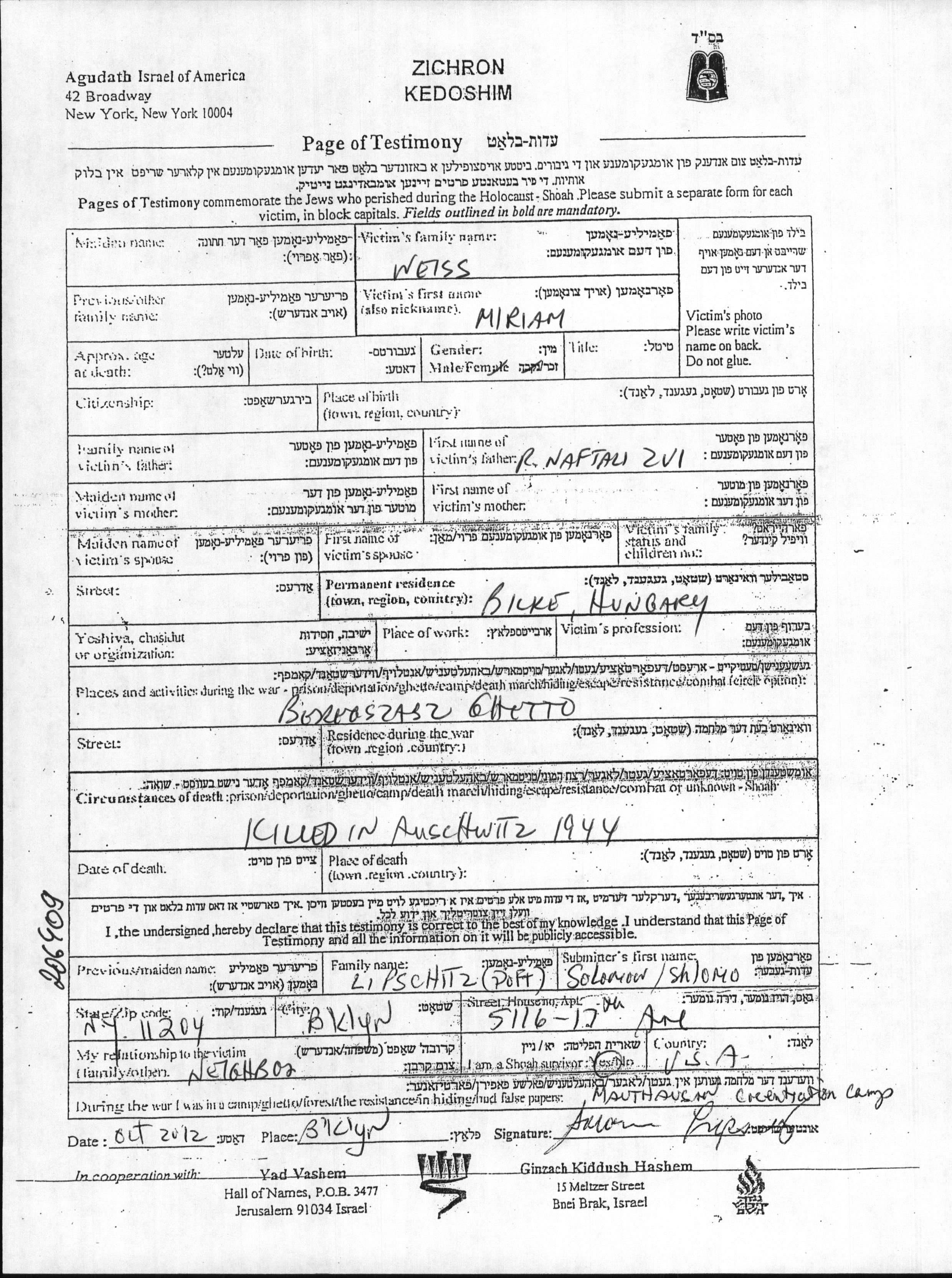 Weiss Miriam Bilke, Tchécoslovaquie Feuille de témoignage
