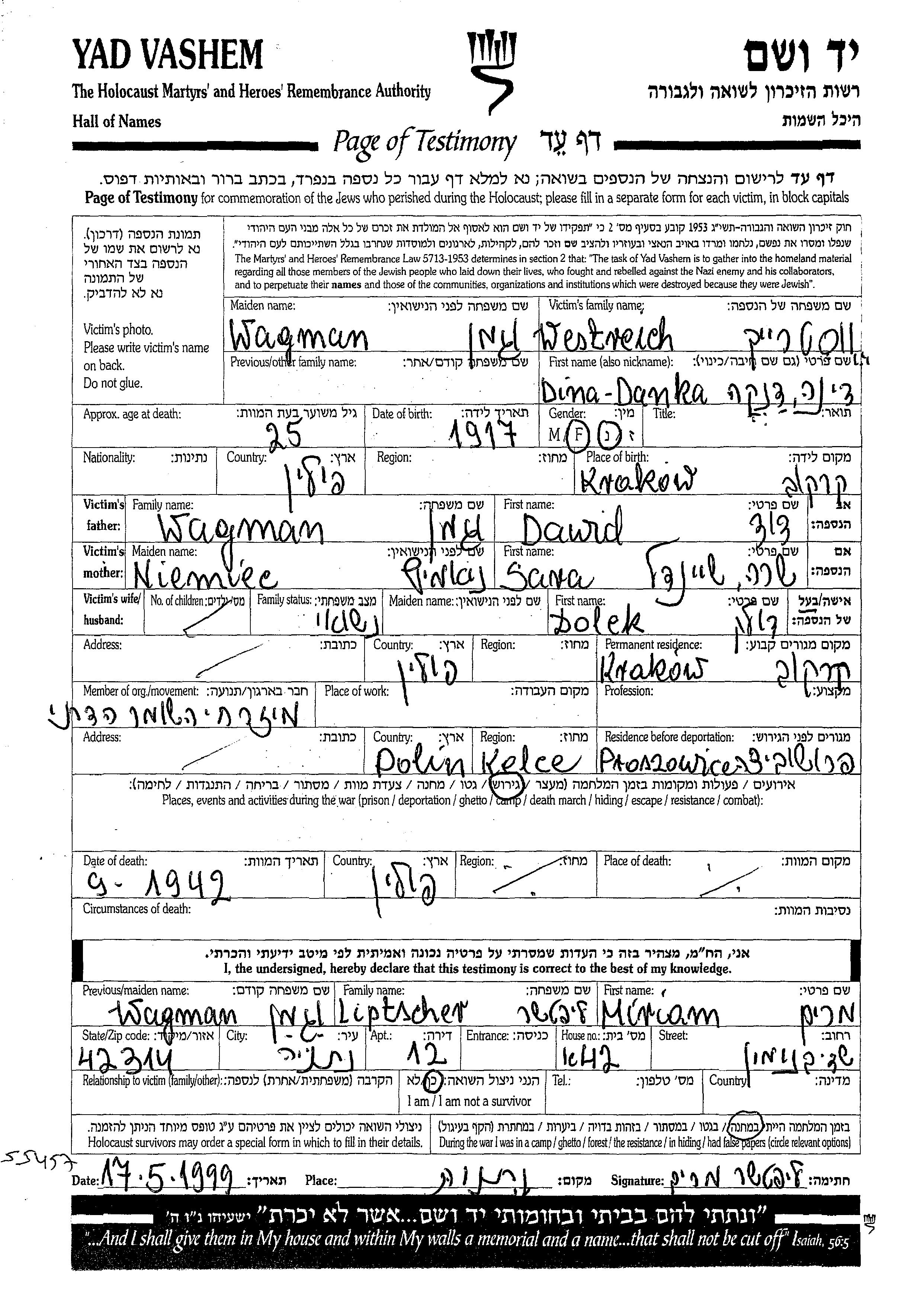 Danka Dina Westreich née Wagman est née à Krakow, Pologne en 1917, fille de Dawid et de Sara Sheindl. Elle était Mariée à Dolek. Avant la seconde guerre mondiale elle vivait à Krakow, Pologne. Pendant la guerre, elle était à Proszowice, Pologne.
