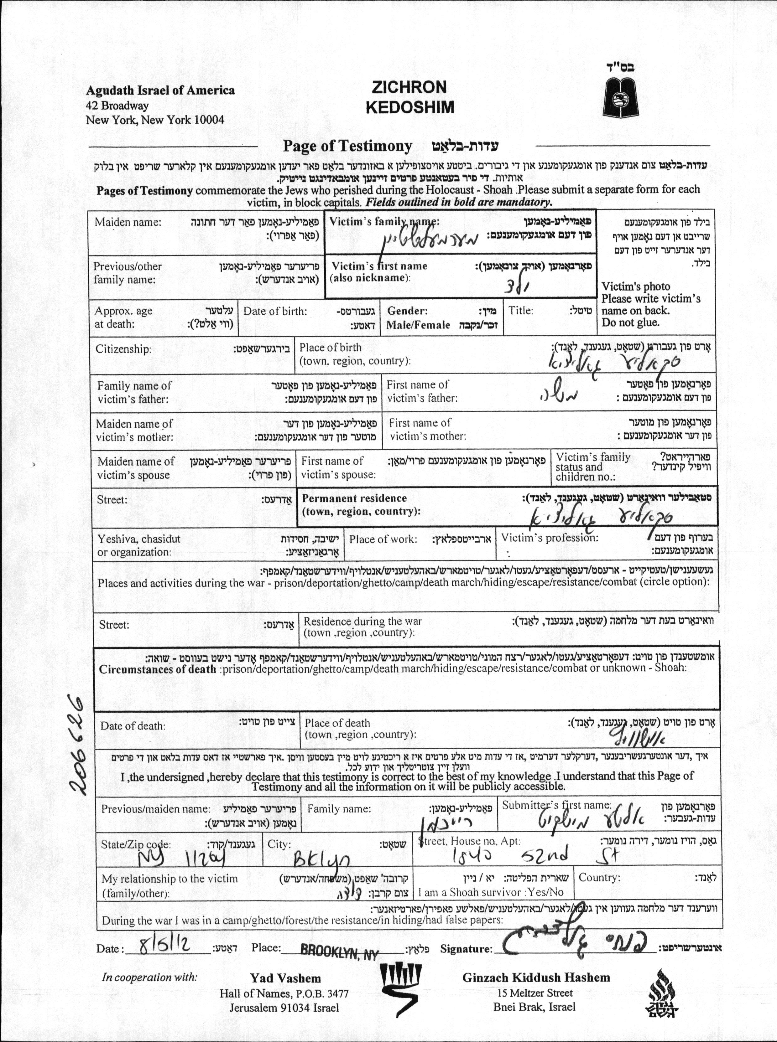 Recherche par lieu de résidence permanente avant la Shoah, ville, village, département, région ou pays.