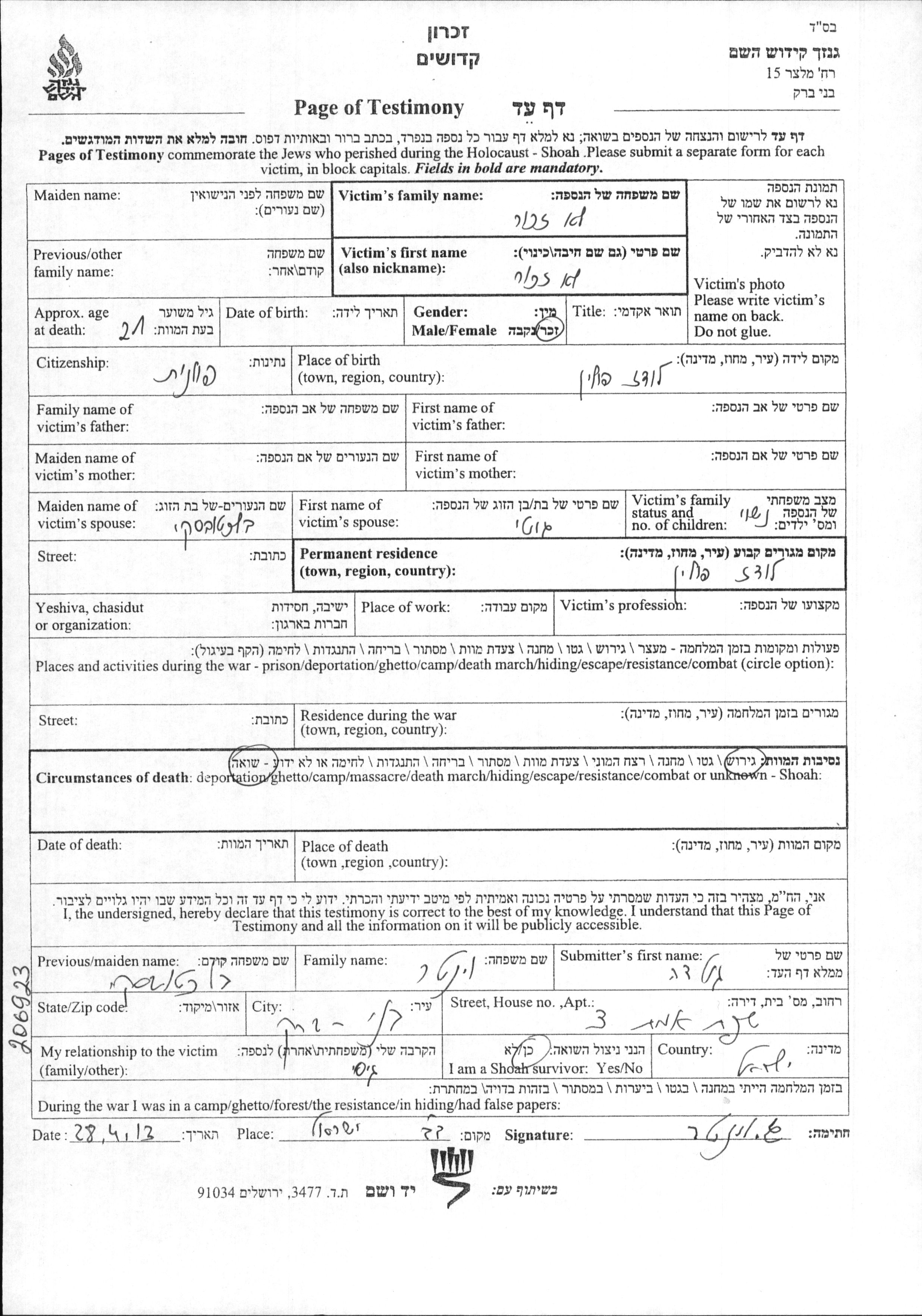 Yad Vashem - Pages of Testimony Names Memorial Collection