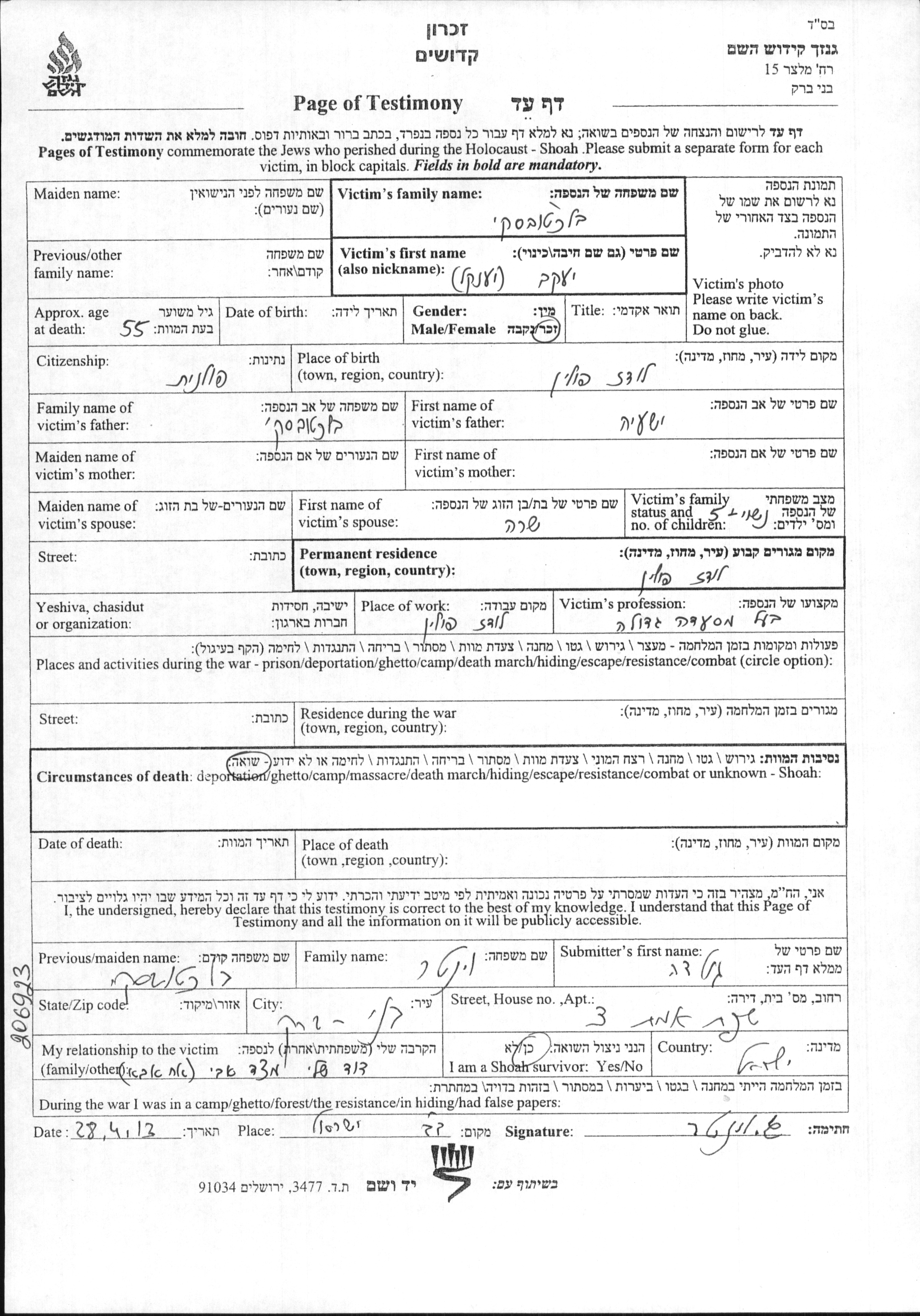 Yad Vashem - Pages of Testimony Names Memorial Collection