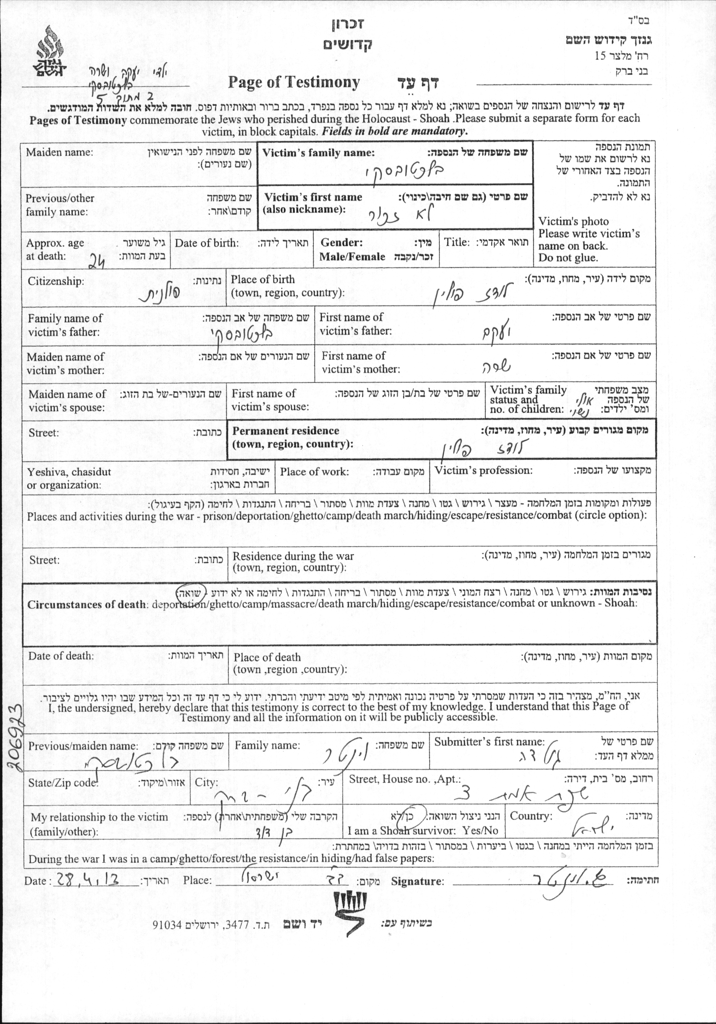 Yad Vashem - Pages of Testimony Names Memorial Collection