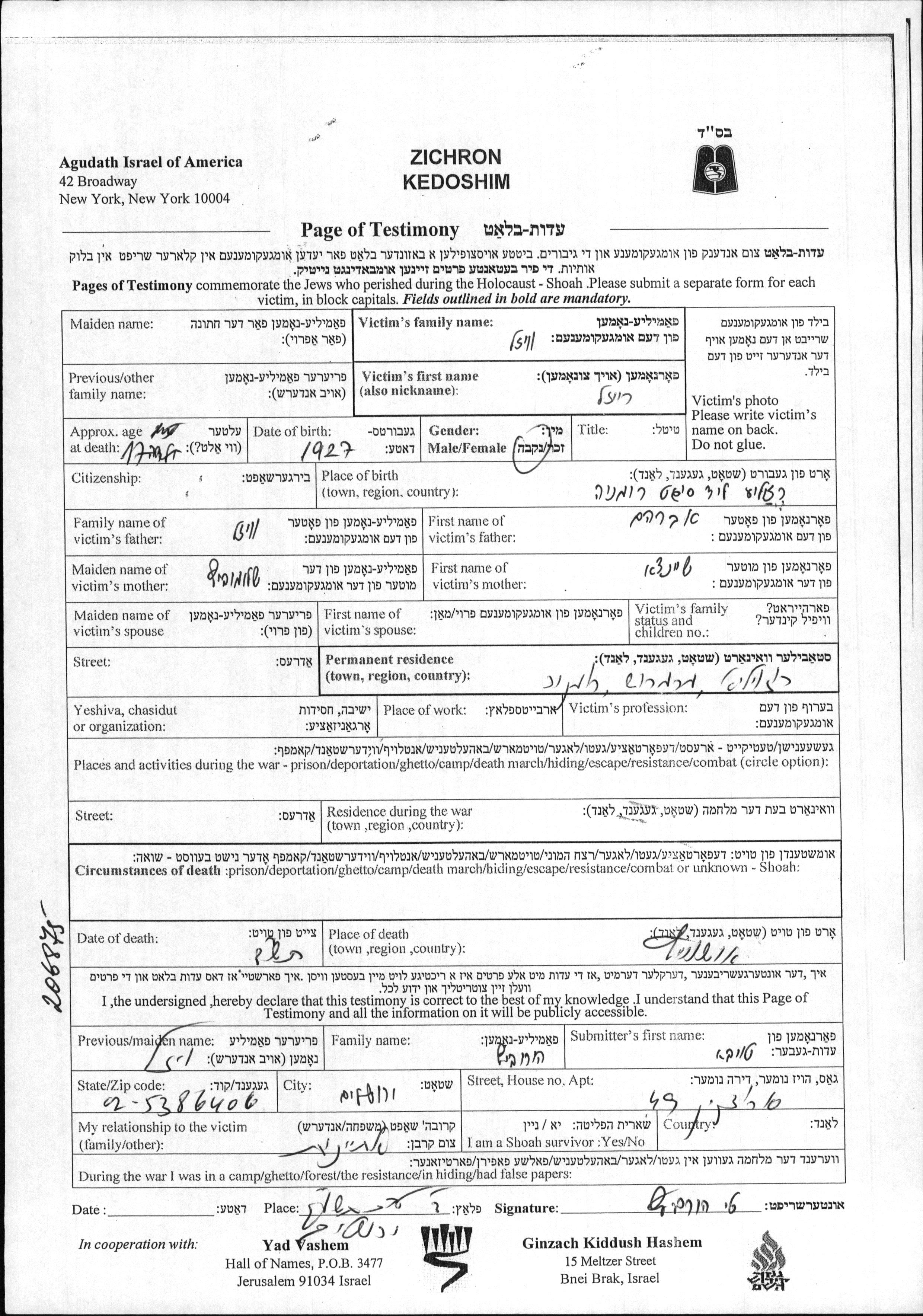 Yad Vashem - Pages of Testimony Names Memorial Collection