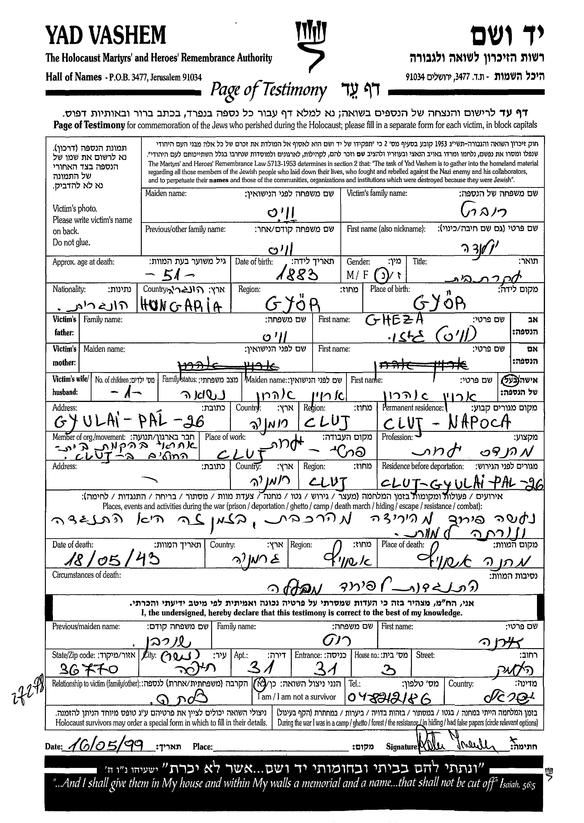 Yad Vashem - Pages of Testimony Names Memorial Collection
