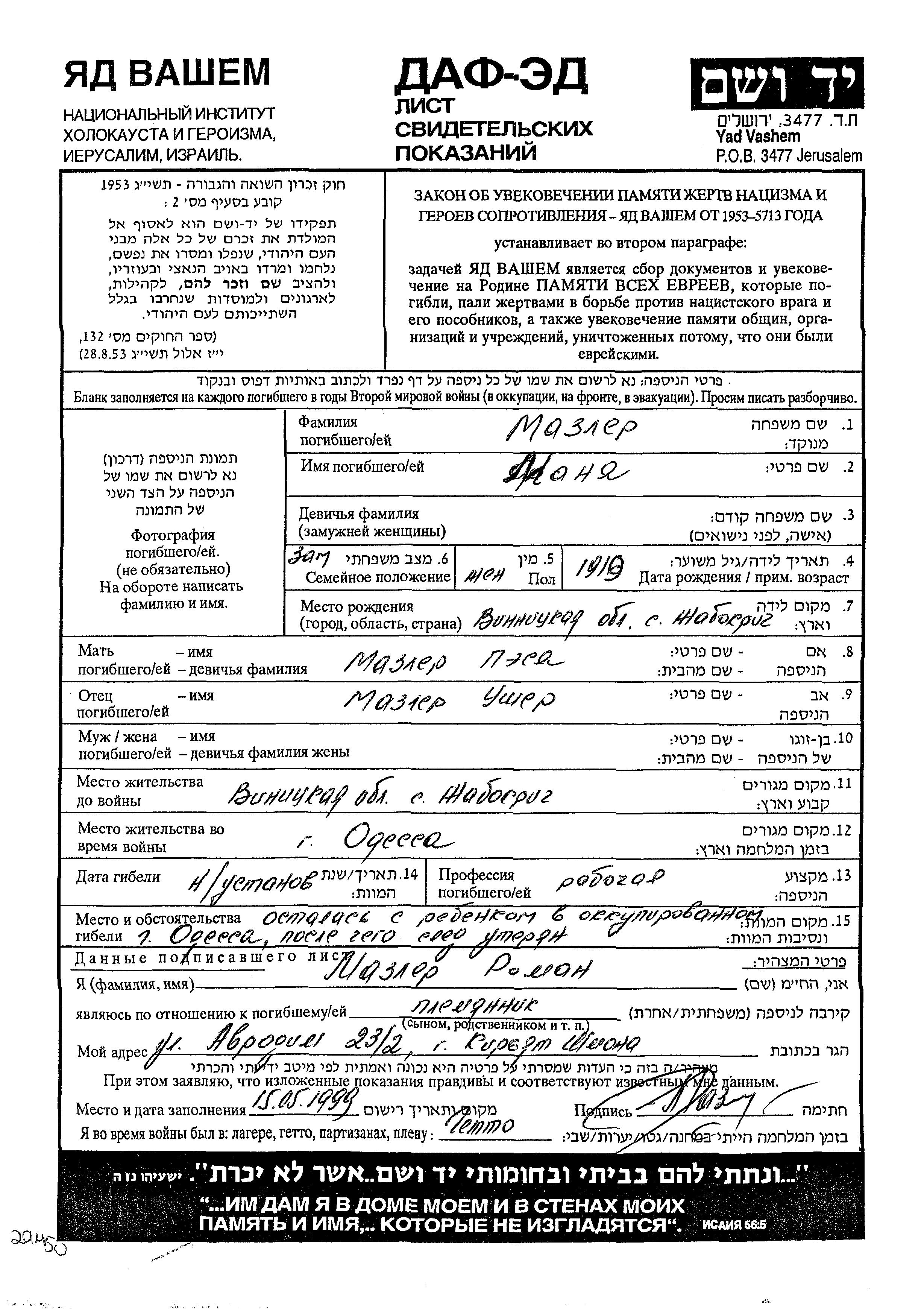 Mazler Manya 1919 Zhabokrich, Ukraine (URSS) Feuille de témoignage