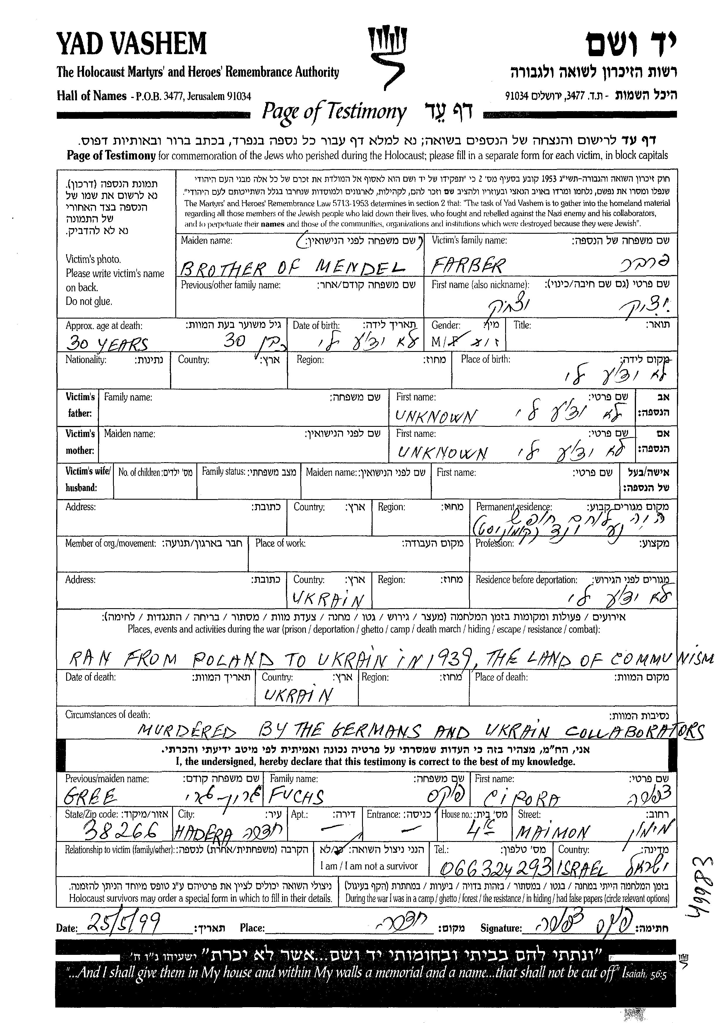 Farber Yitzkhak endroit inconnu, Feuille de témoignage