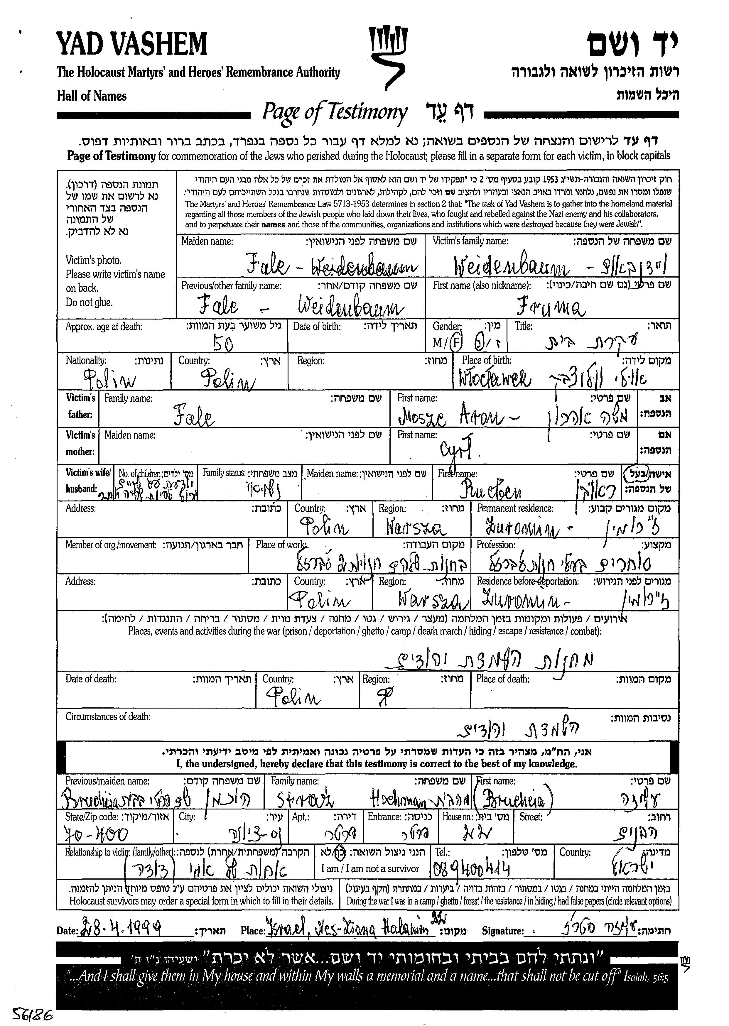 Weidenbaum Fruma Zuromin, Pologne Feuille de témoignage