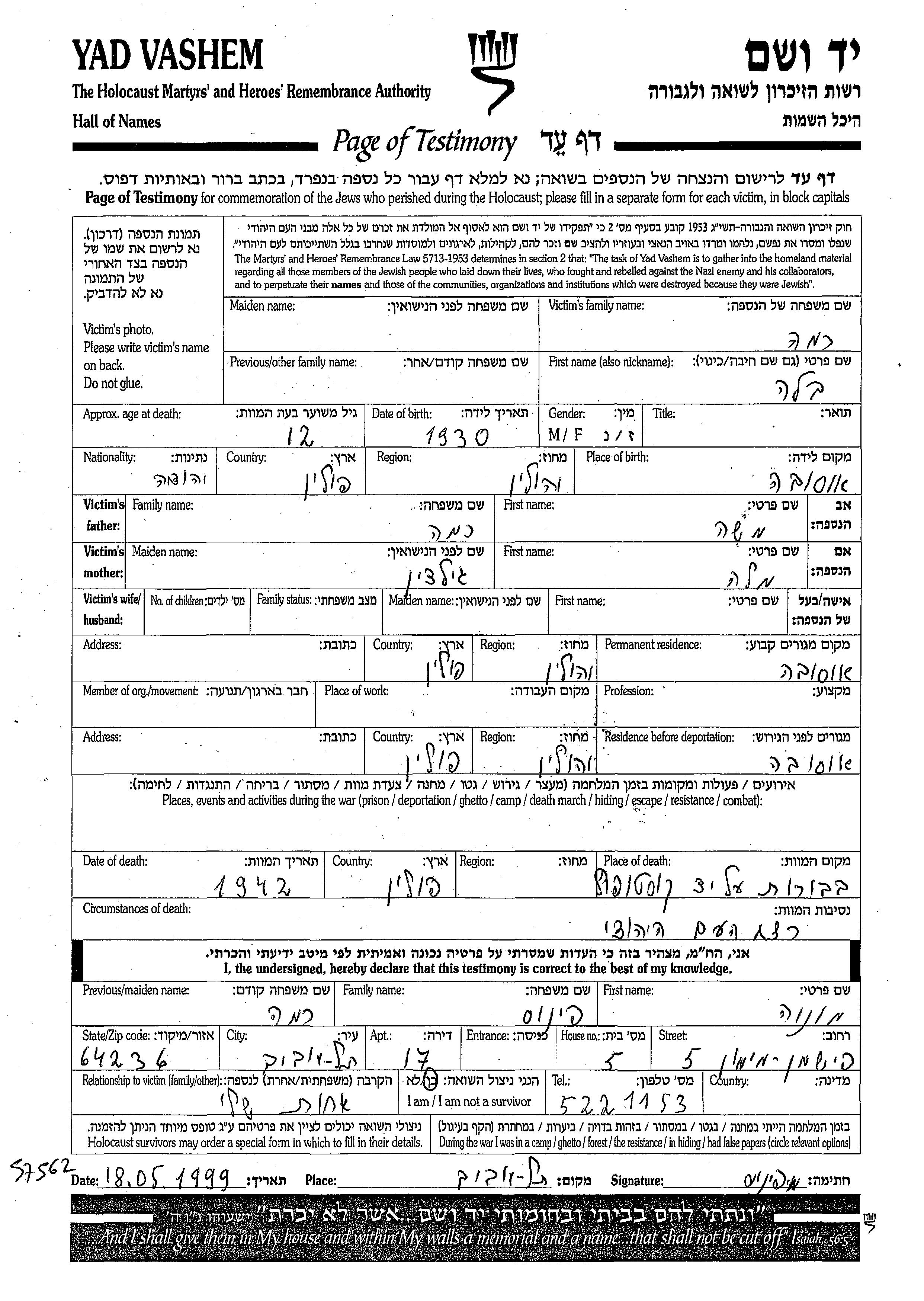 Yad Vashem - Pages of Testimony Names Memorial Collection