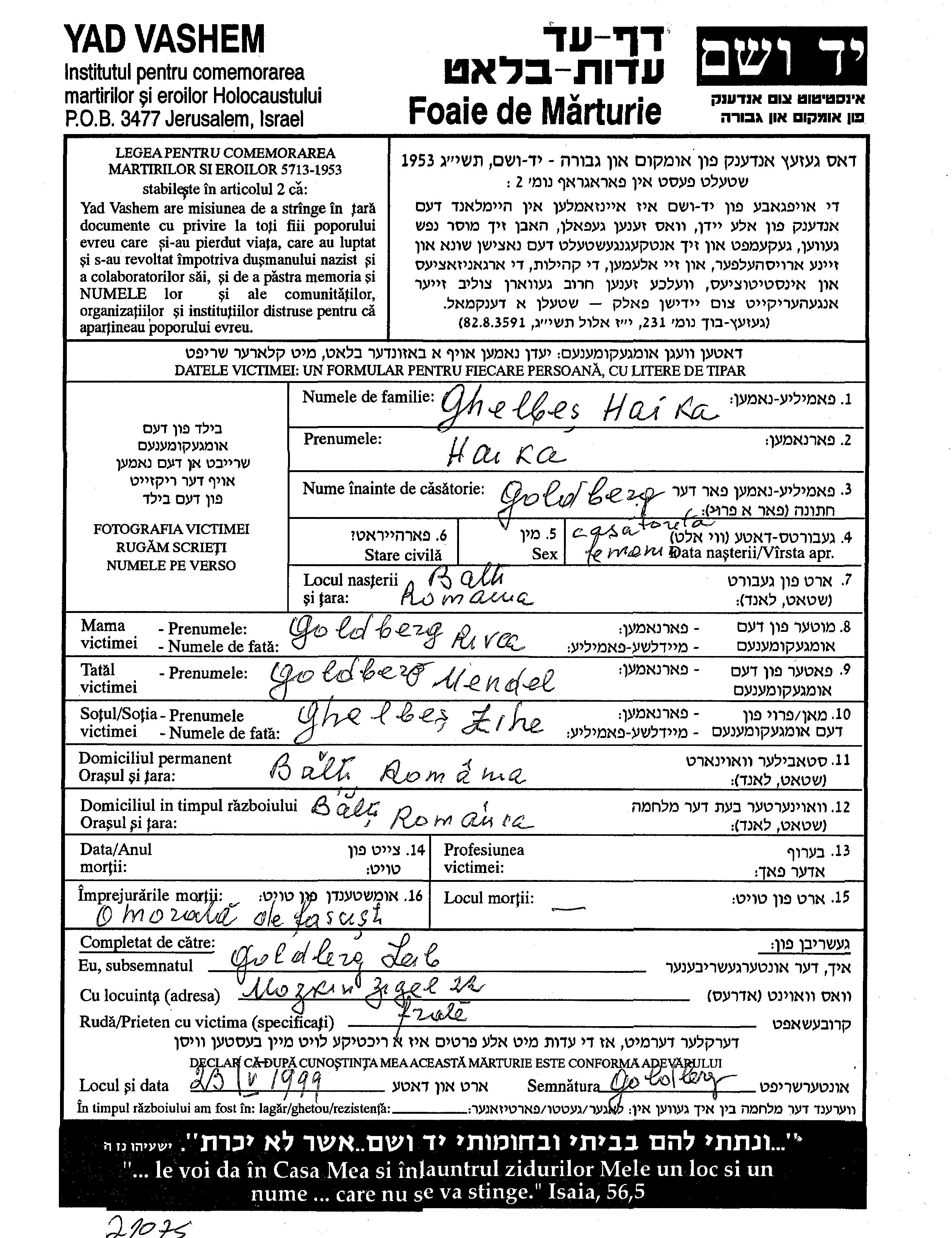 Ghelbes Haika Bălți, Roumanie Feuille de témoignage
