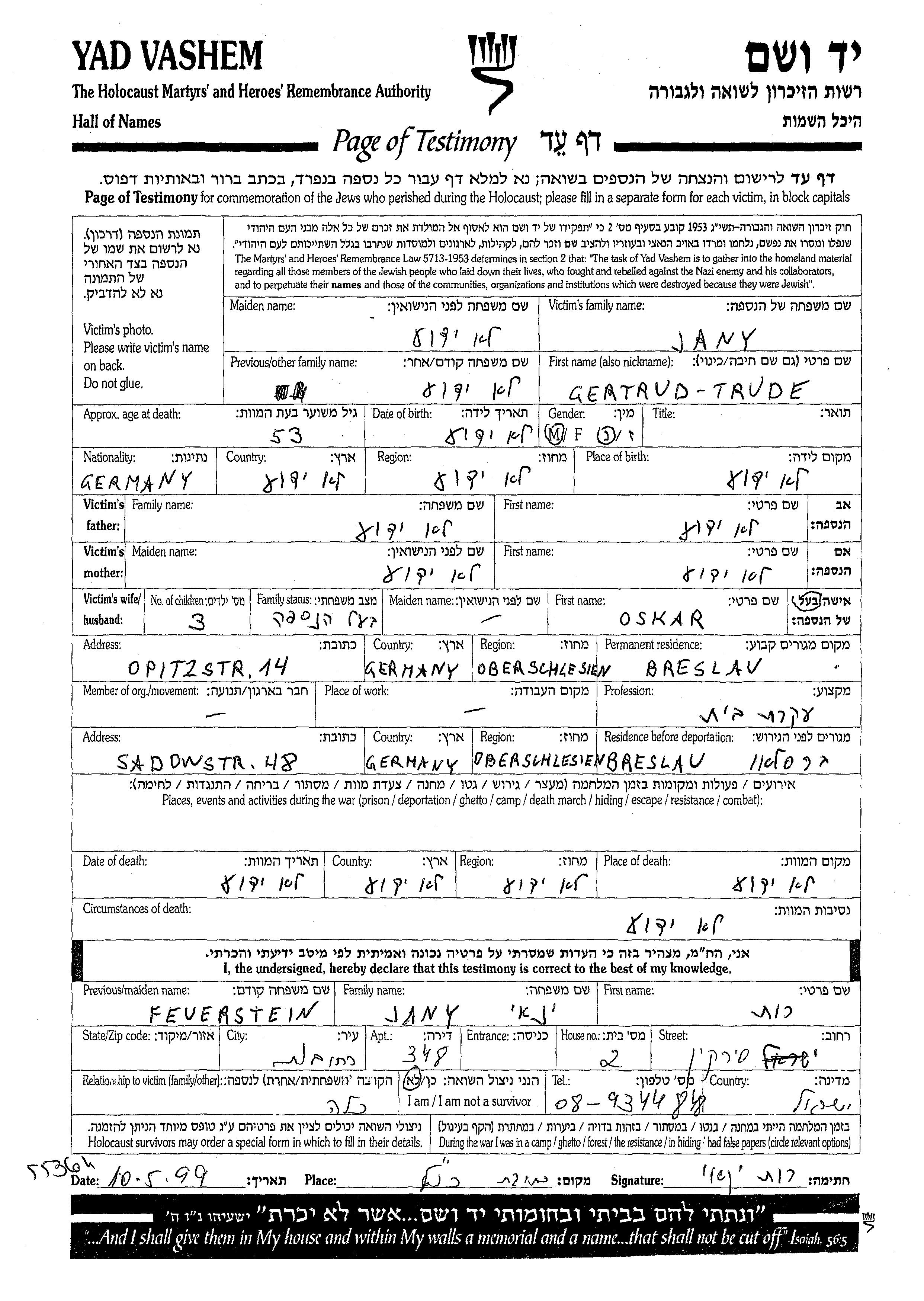 Jany Gertrud Breslau, Allemagne Feuille de témoignage