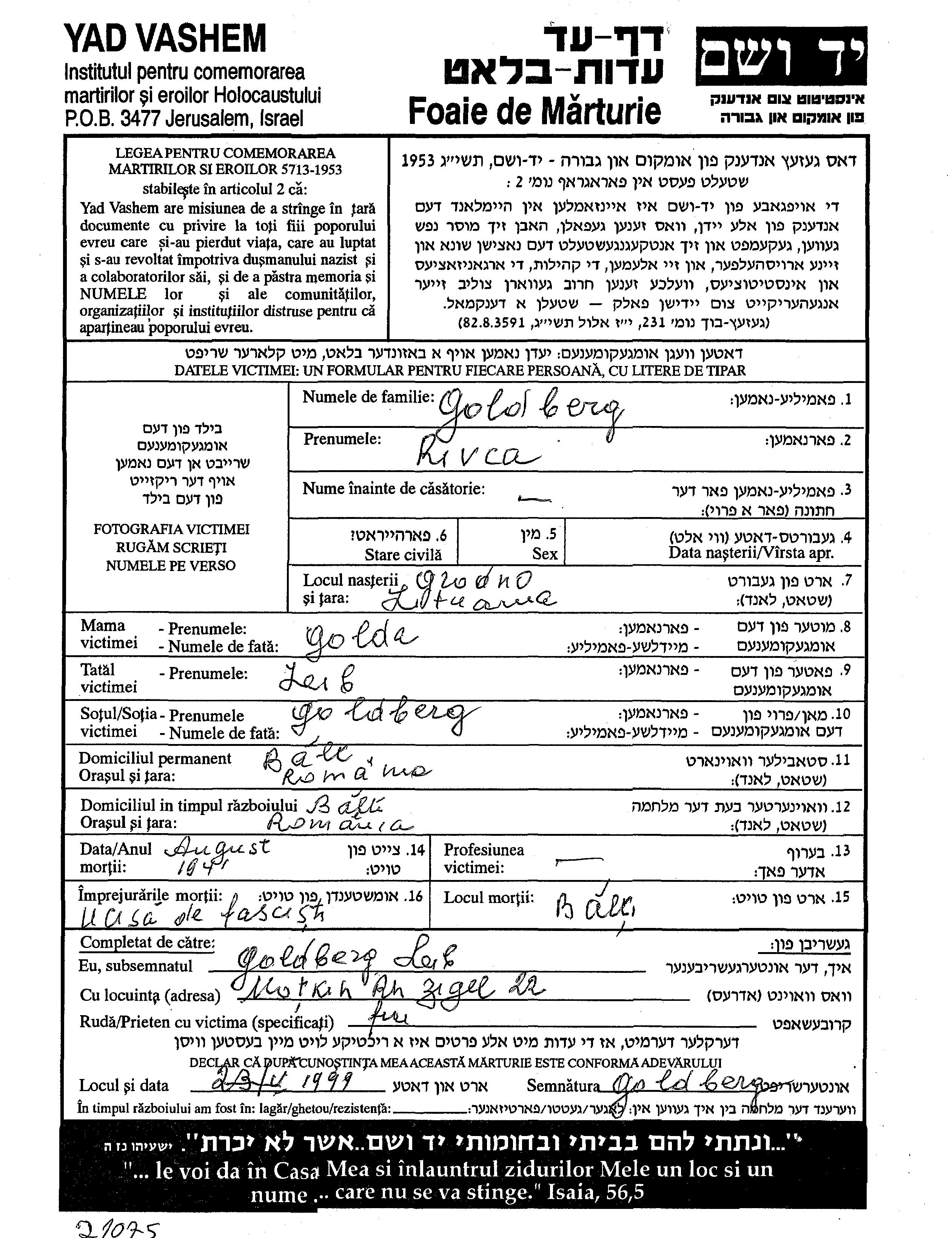 Goldberg Rivca Bălți, Roumanie Feuille de témoignage