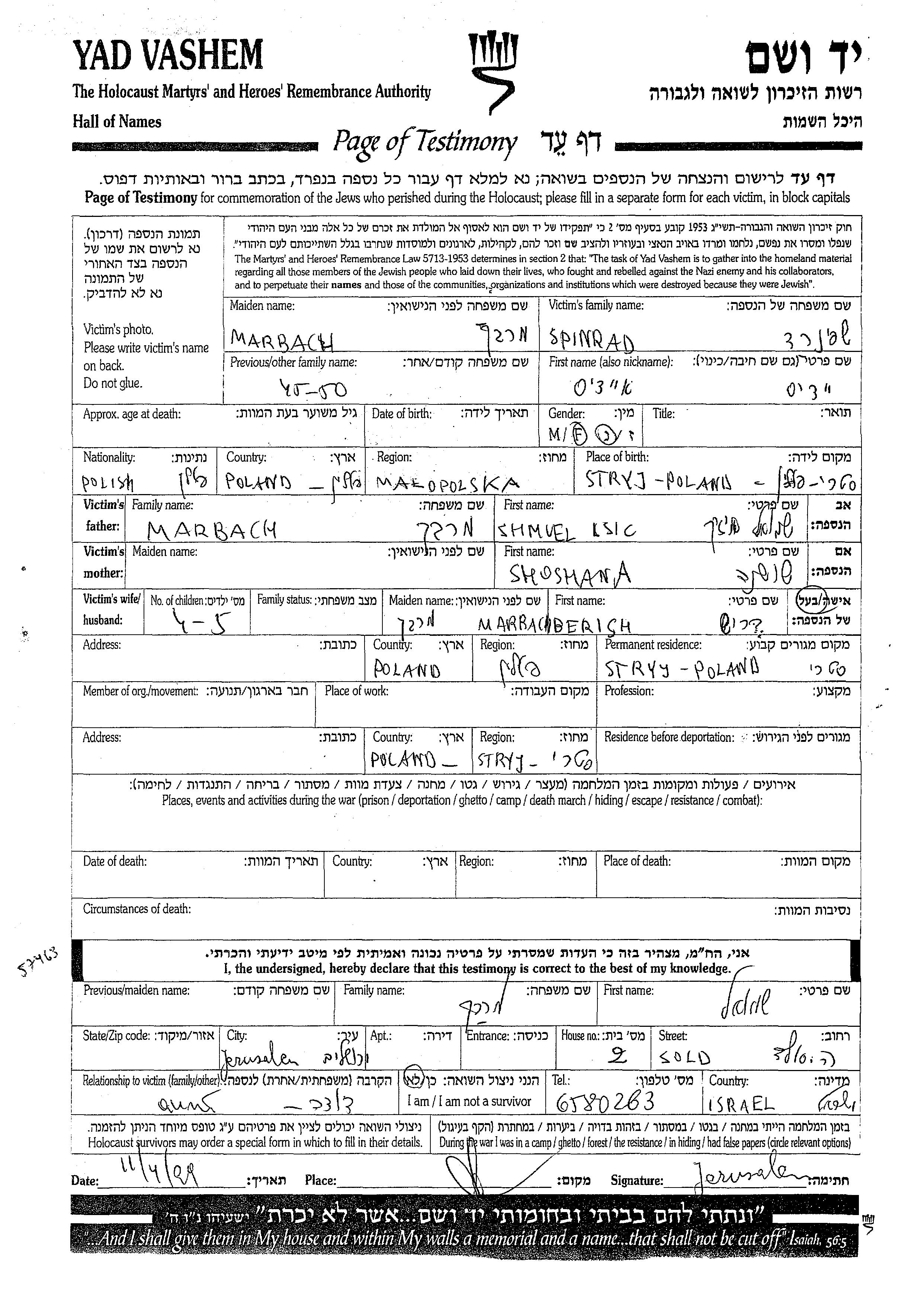 Spinrad Eidis Stryj, Pologne Feuille de témoignage