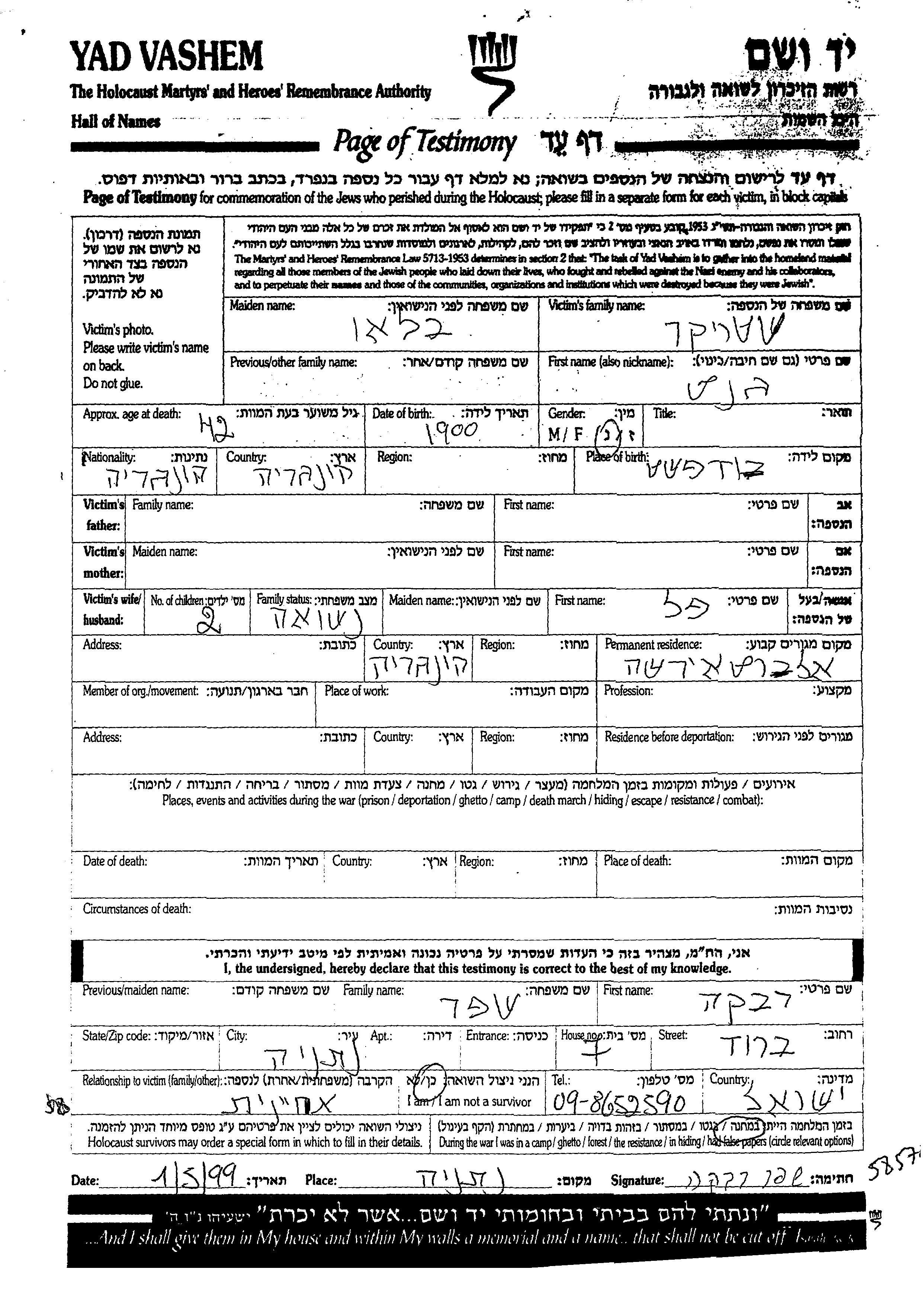 Yad Vashem - Pages of Testimony Names Memorial Collection
