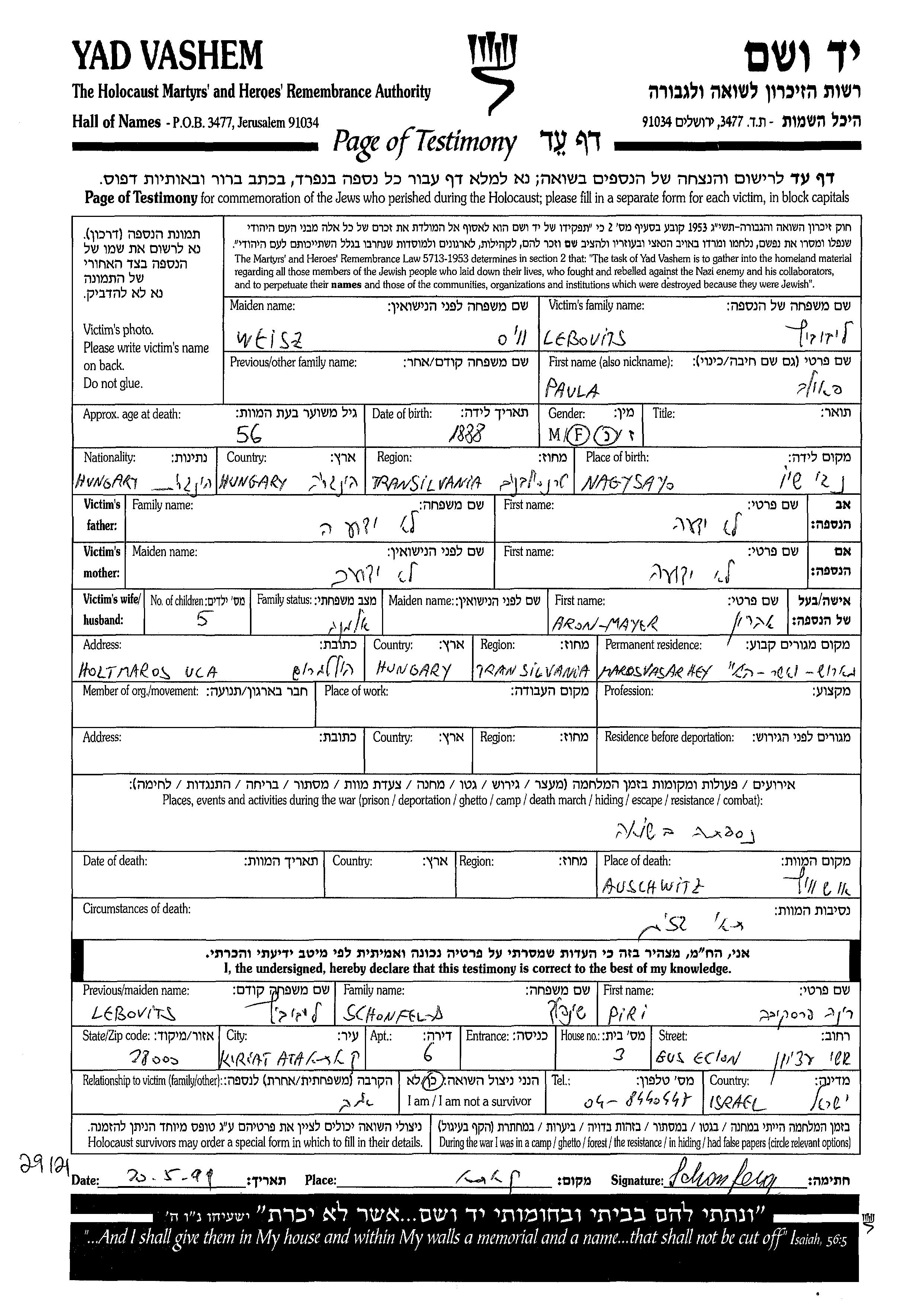 Lebovits Paula 1888 Marosvasarhely, Roumanie Feuille de témoignage