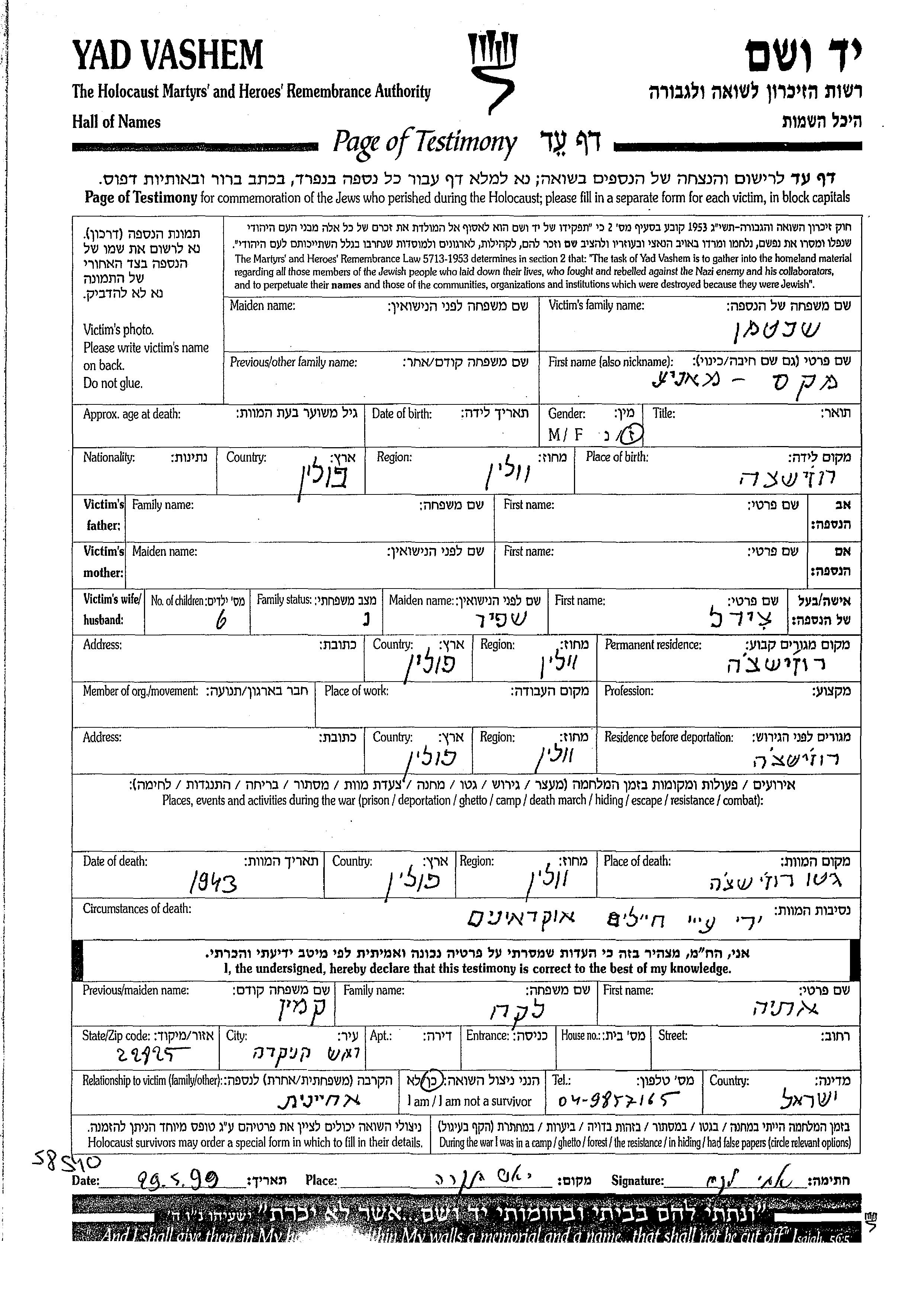 Shekhtman Max Manie Rozishche, Pologne Feuille de témoignage