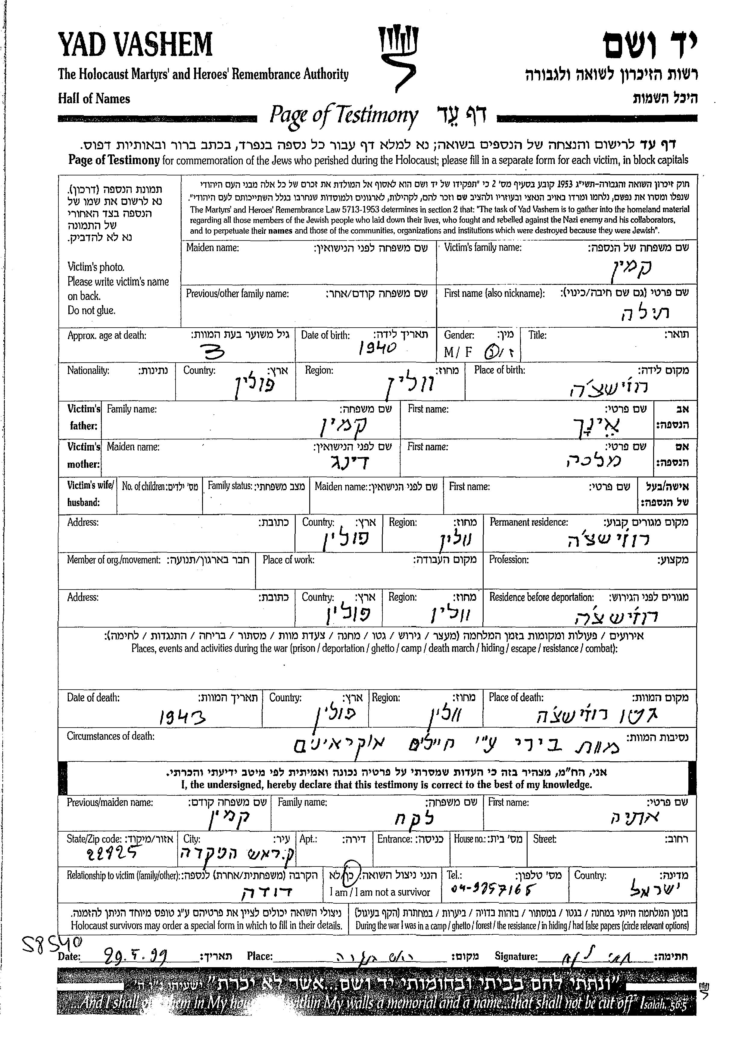Yad Vashem - Pages of Testimony Names Memorial Collection
