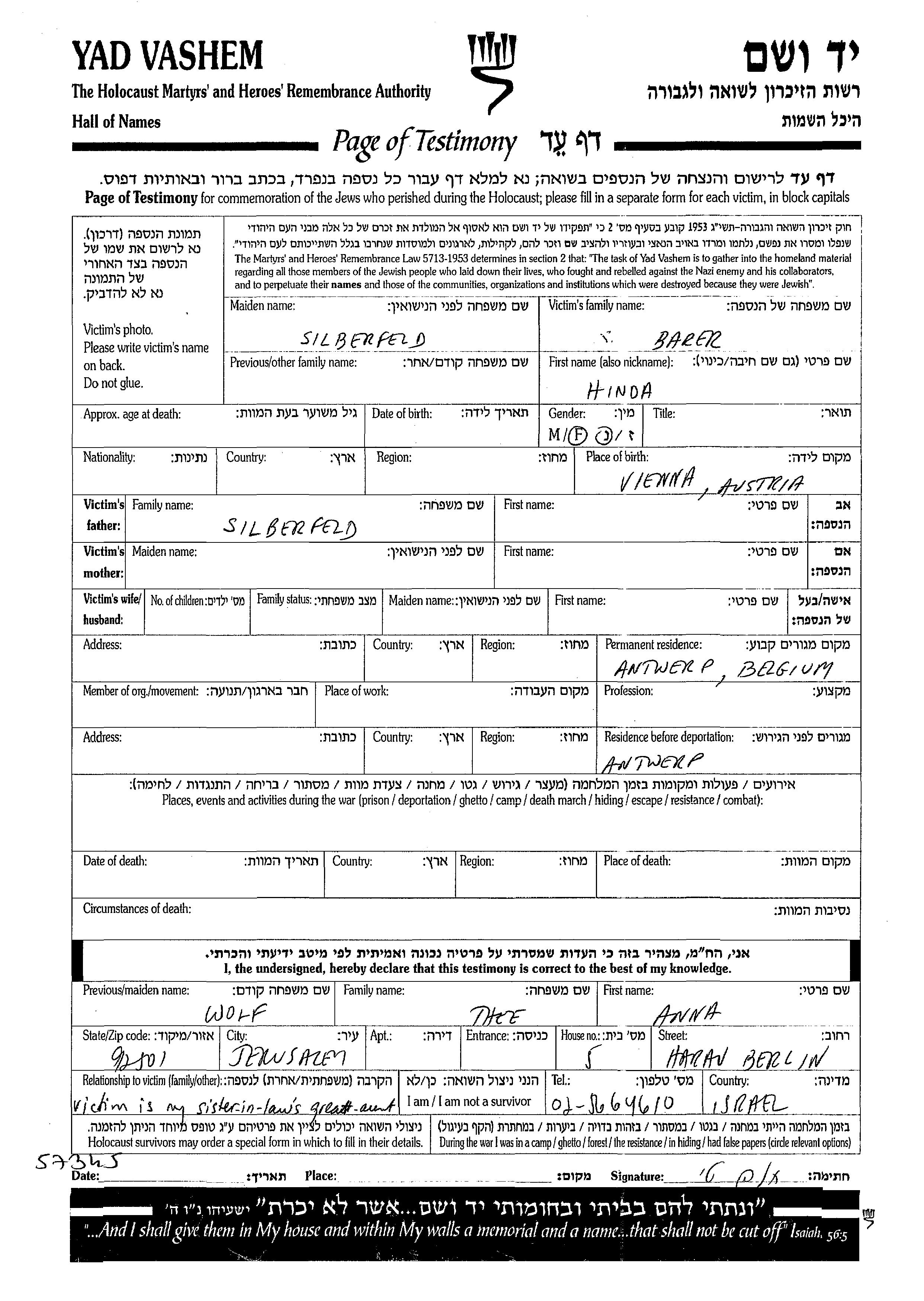 Barer Hinda Antwerpen, Belgique Feuille de témoignage