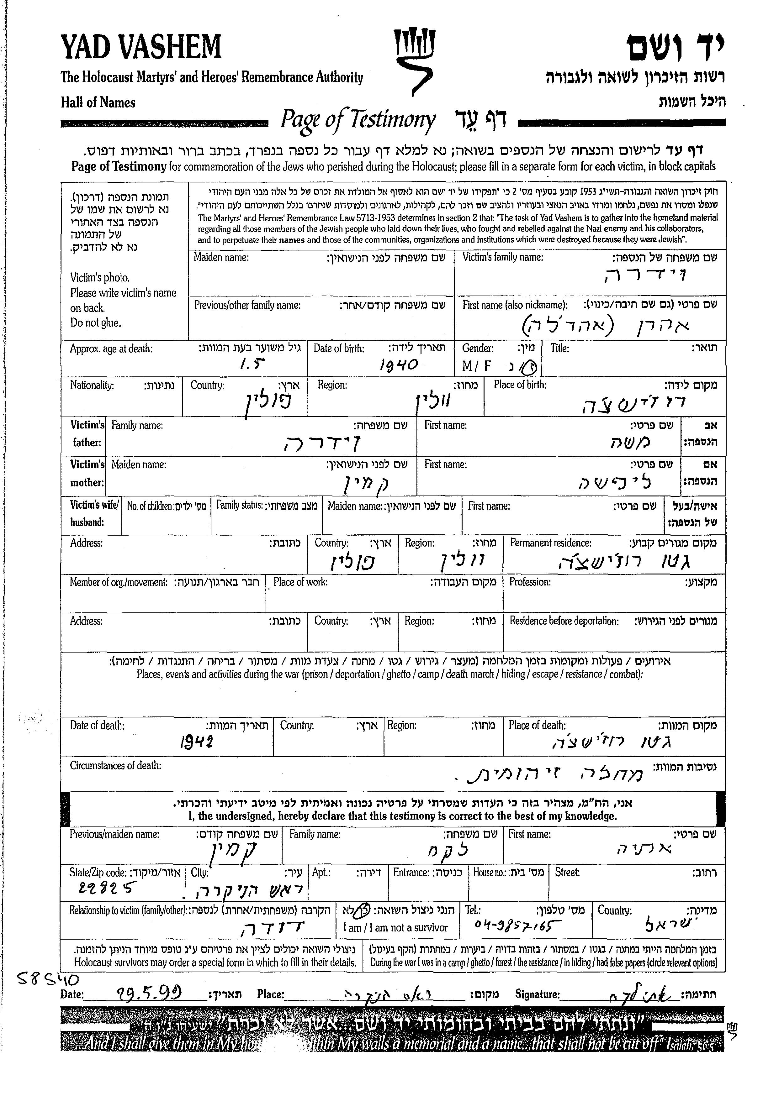 Yad Vashem - Pages of Testimony Names Memorial Collection