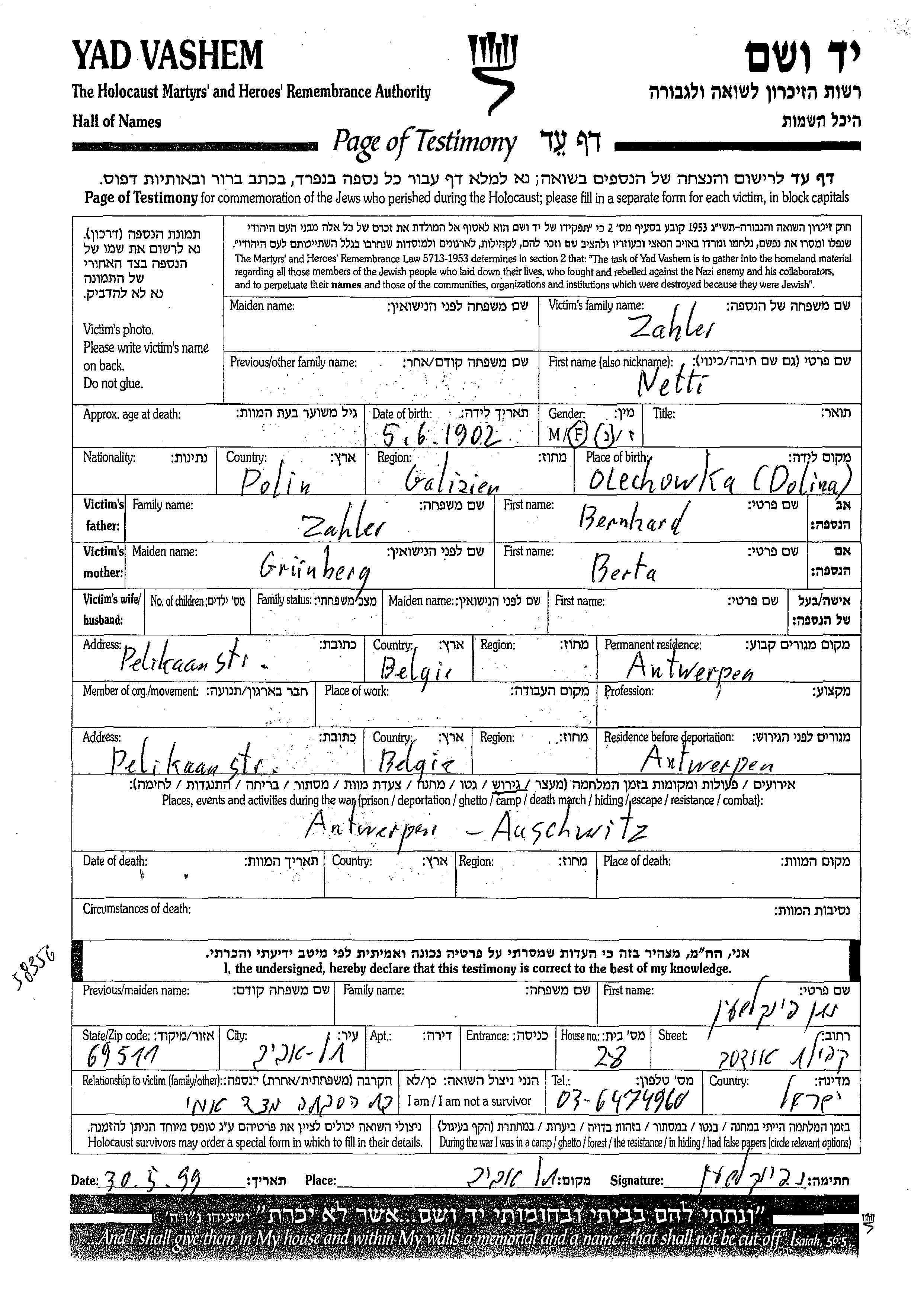 Netti Zahler est née à Dolina, Pologne en 1902, fille de Bernhard et de Berta. Avant la seconde guerre mondiale elle vivait à Antwerpen, Belgique. Pendant la guerre, elle était à Antwerpen, Belgique.
