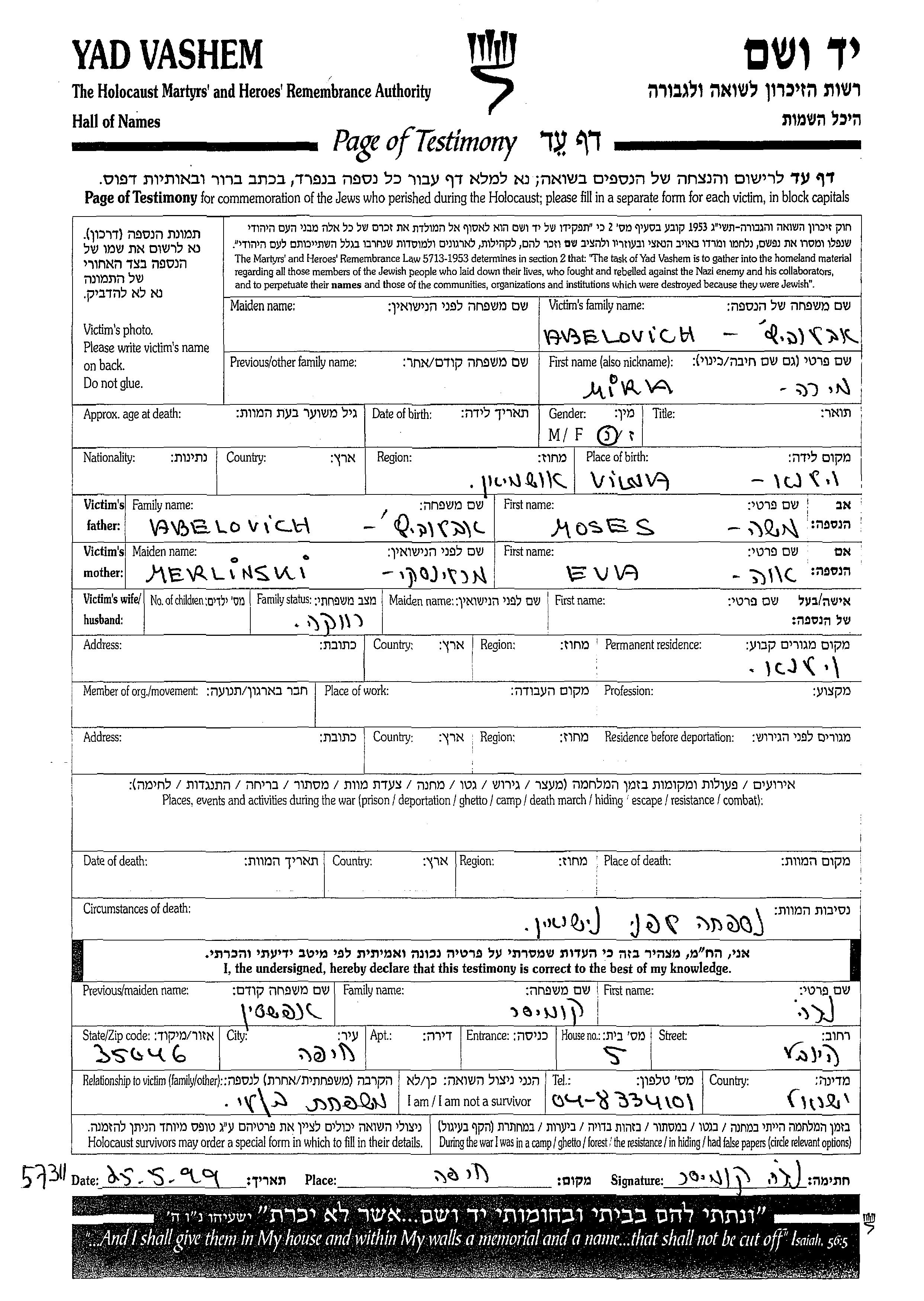 Abelovich Mira Wilno, Pologne Feuille de témoignage