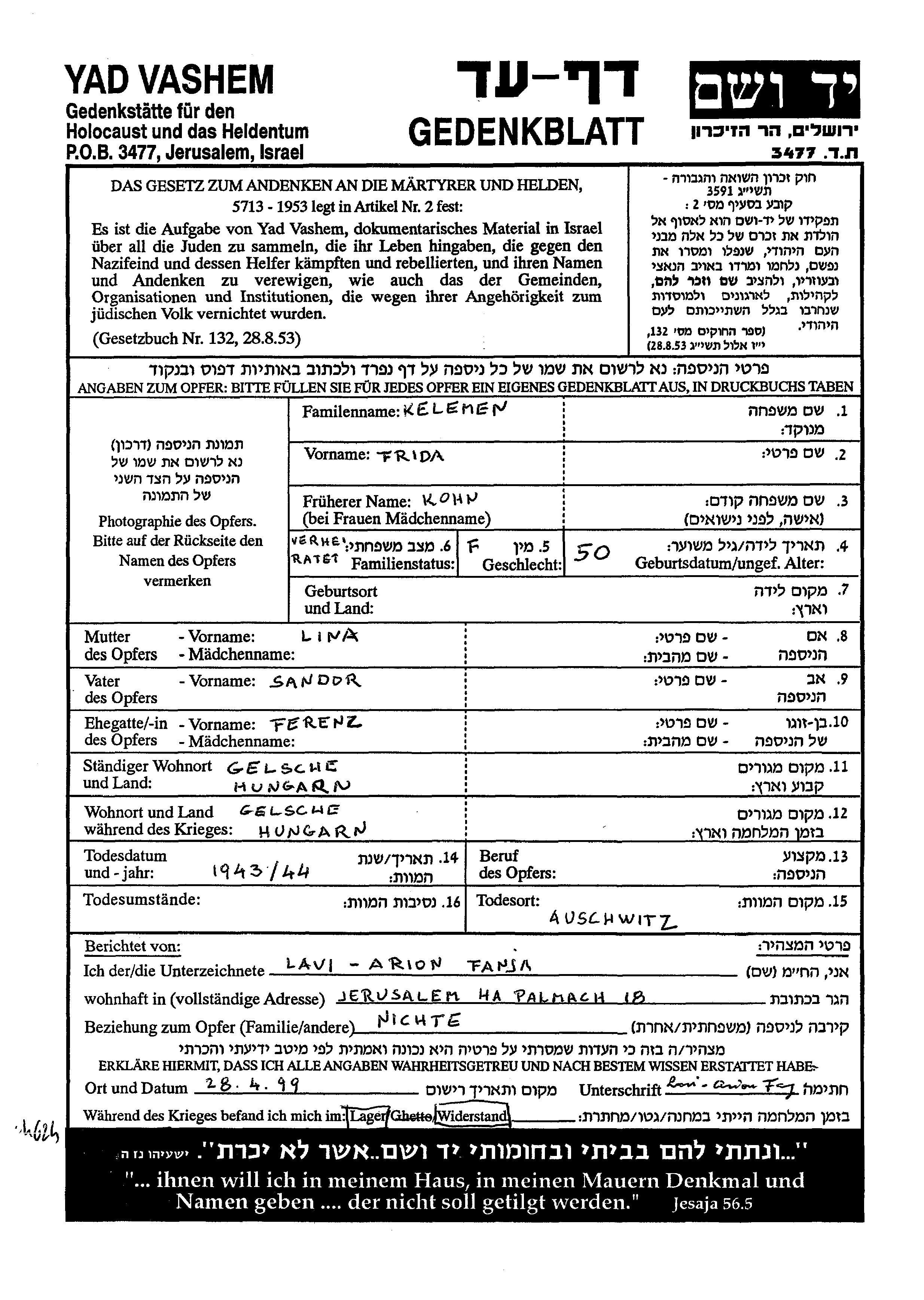 Kelemen Frida Gelse, Hongrie Feuille de témoignage