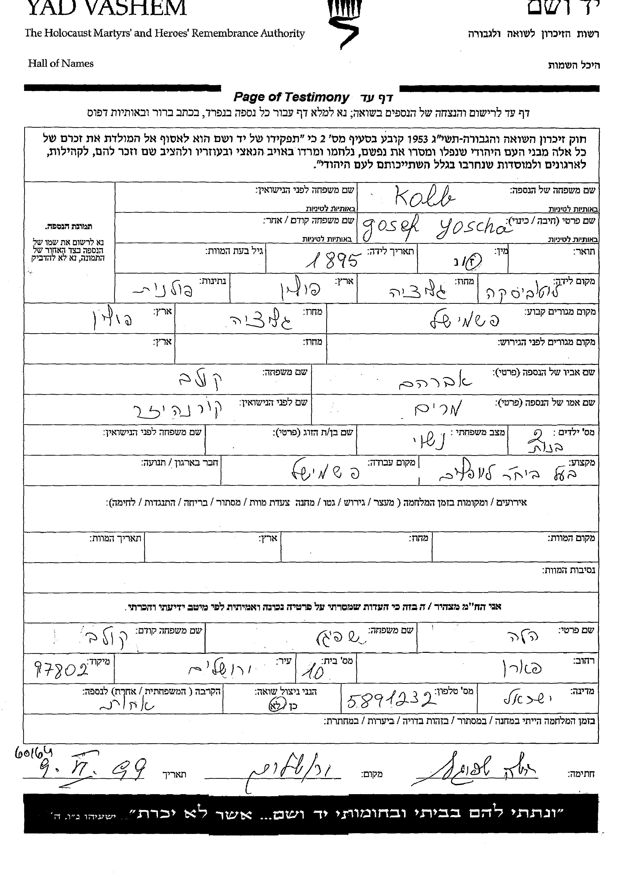 Kolb Gosef 1895 Przemysl, Pologne Feuille de témoignage