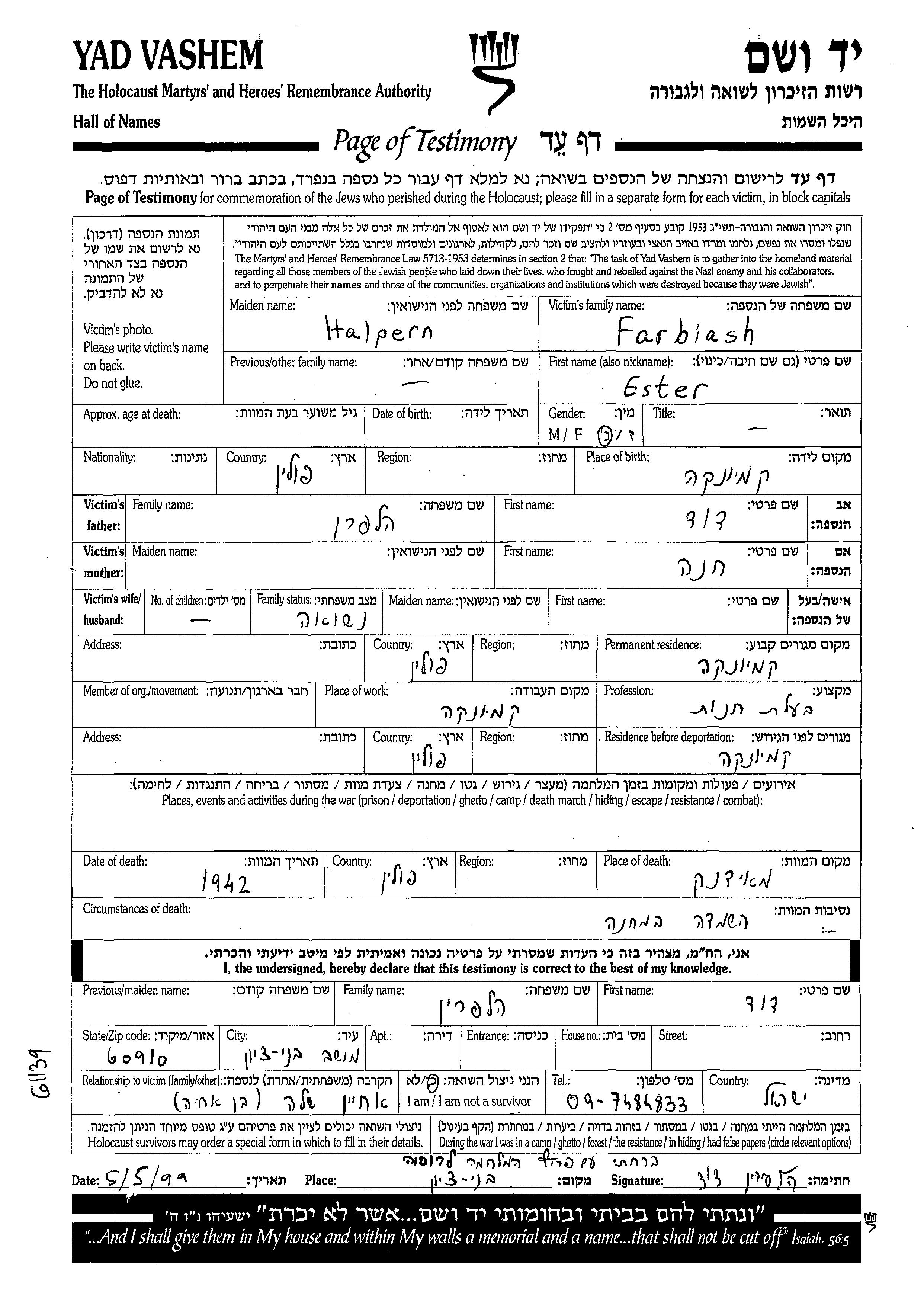 Farbiash Ester Kamionka, Pologne Feuille de témoignage