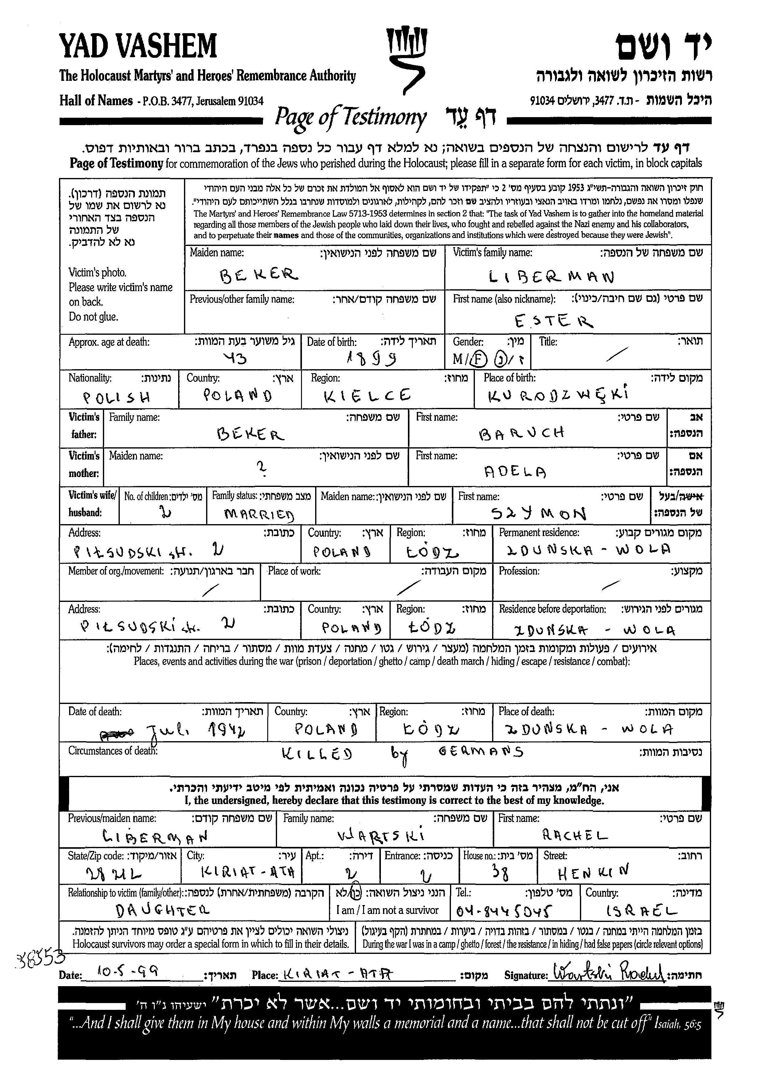 Ester Liberman née Beker est née à Kurozweki, Pologne en 1899, fille de Baruch et de Adela. Elle était Mariée à Szymon. Avant la seconde guerre mondiale elle vivait à Zdunska Wola, Pologne. Pendant la guerre, elle était à Zdunska Wola, Pologne.