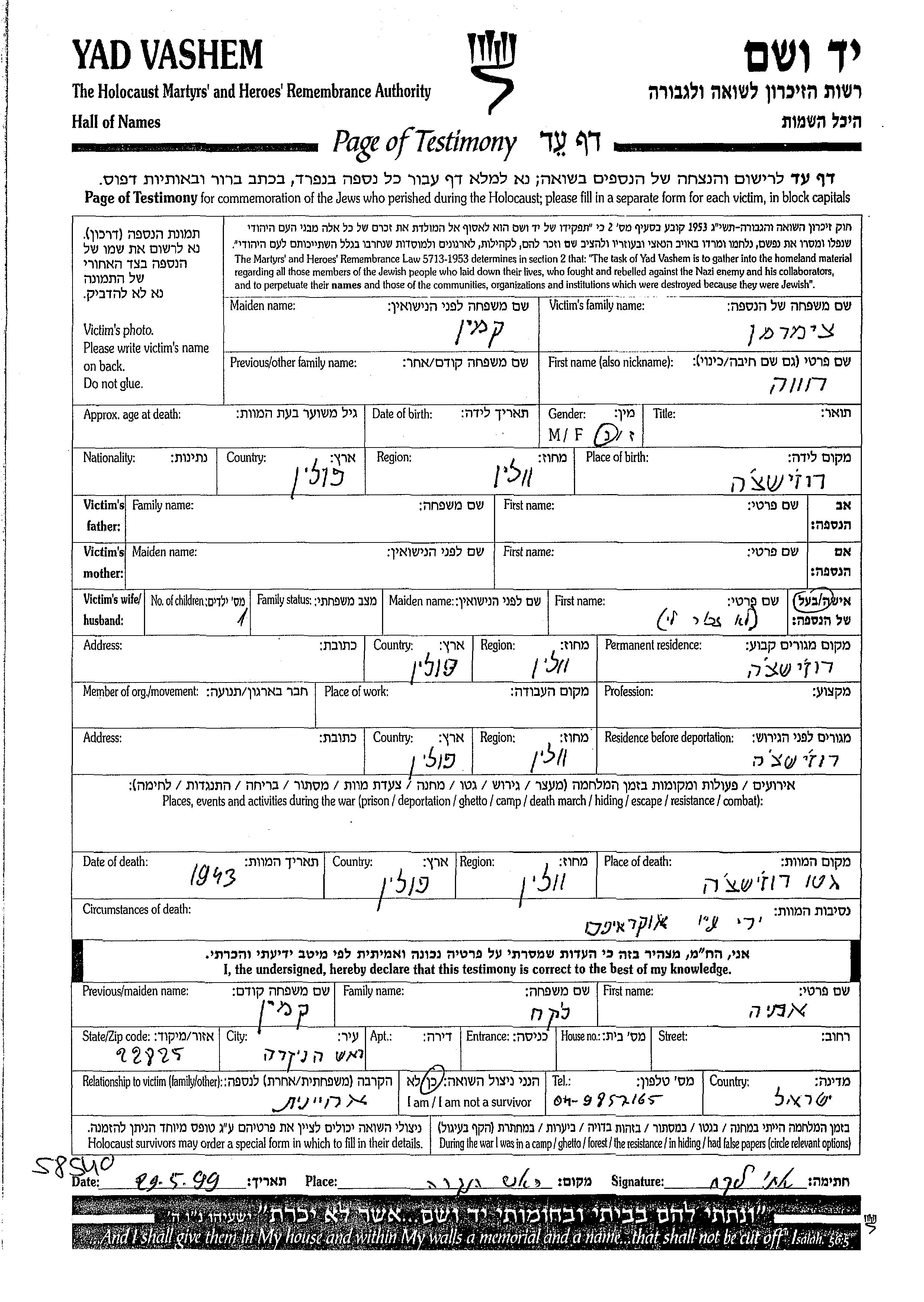 Tzimerman Khava Rozisce, Pologne Feuille de témoignage