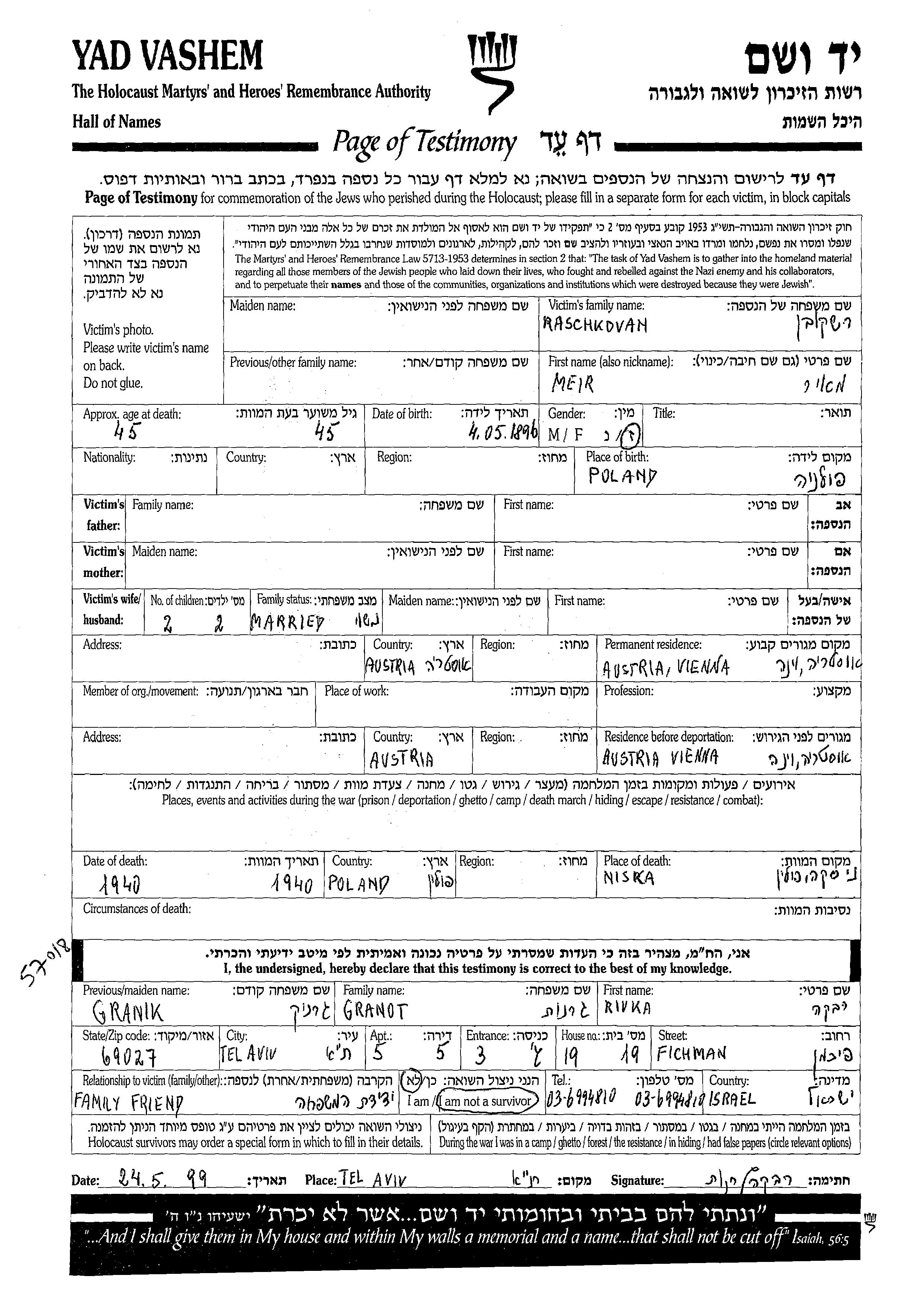 Meir a été assassiné pendant la Shoah. Lieu de la mort: Niska, Pologne en 1940.