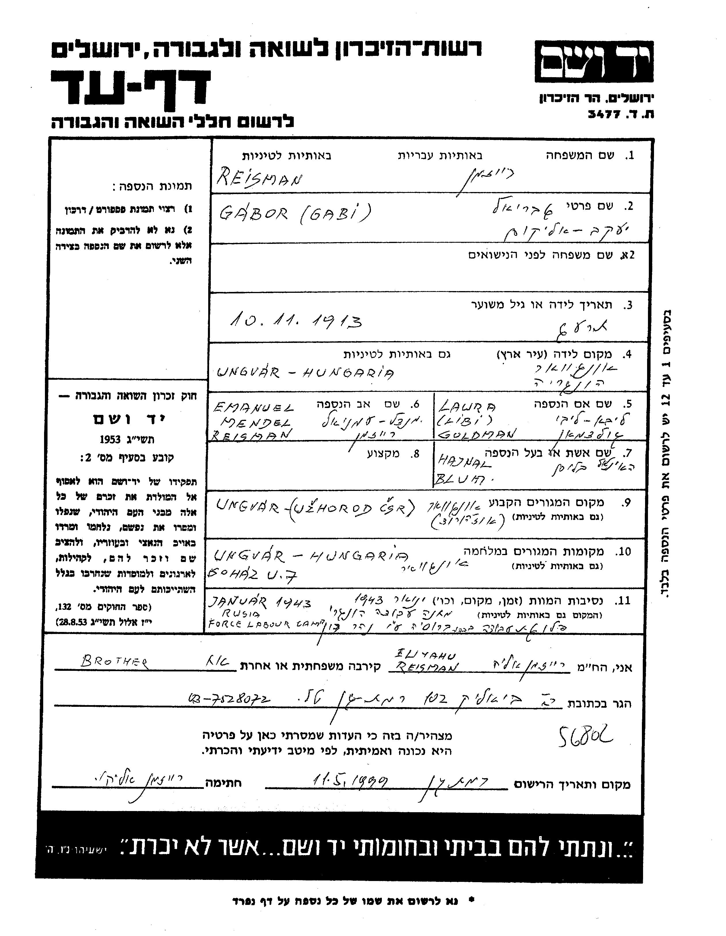 Reisman Gabor Yaakov Eliakim 1913 Ungvar, Tchécoslovaquie Feuille de témoignage