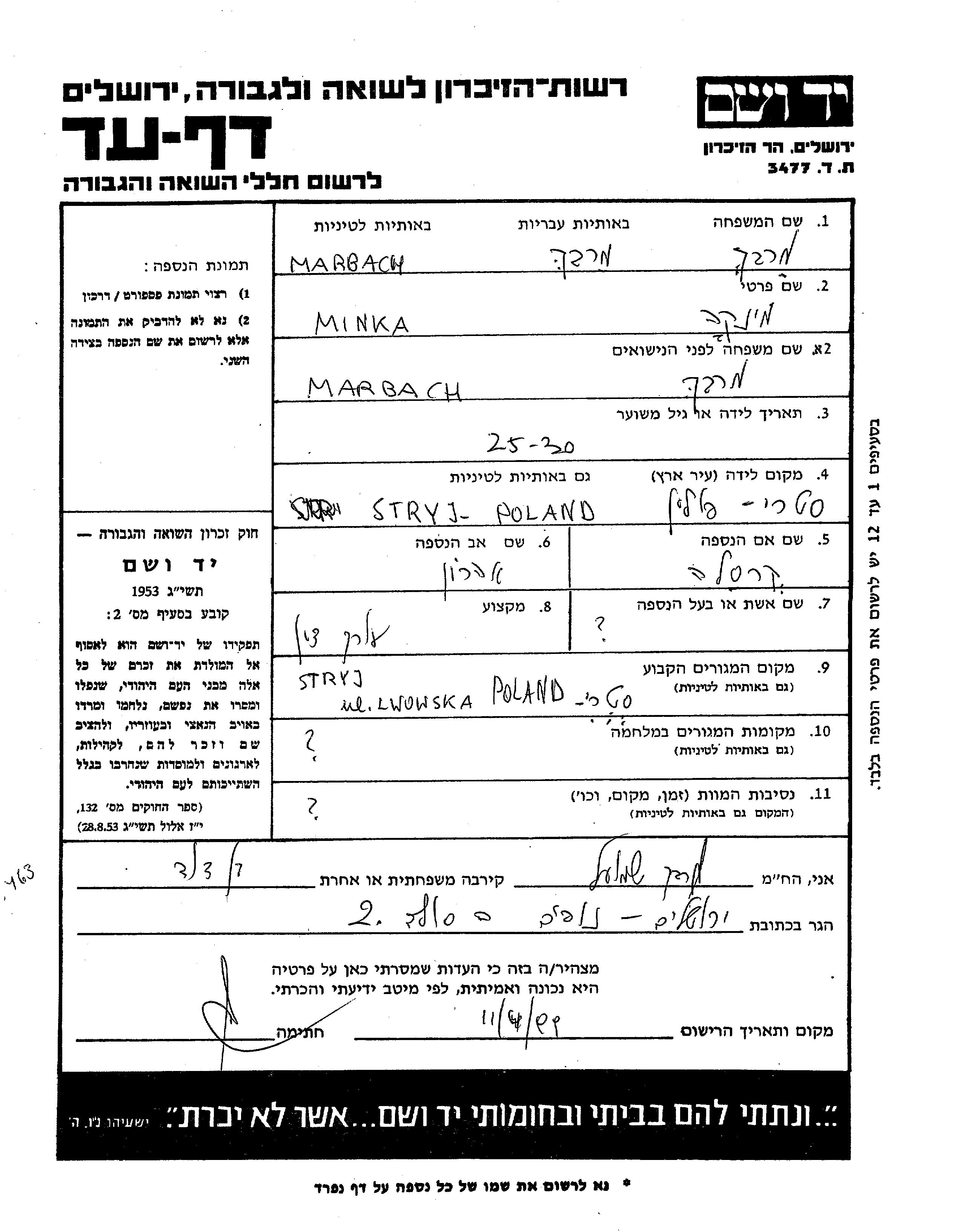 Marbach Minka Stryj, Pologne Feuille de témoignage