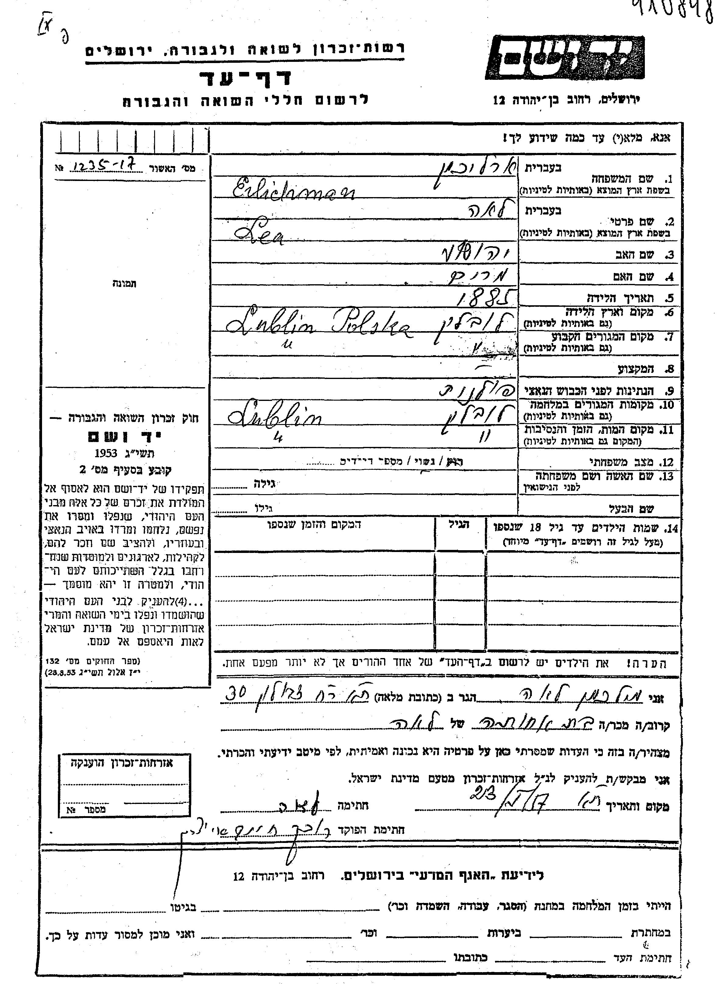 Erlichman Lea 1885 Lublin, Pologne Feuille de témoignage