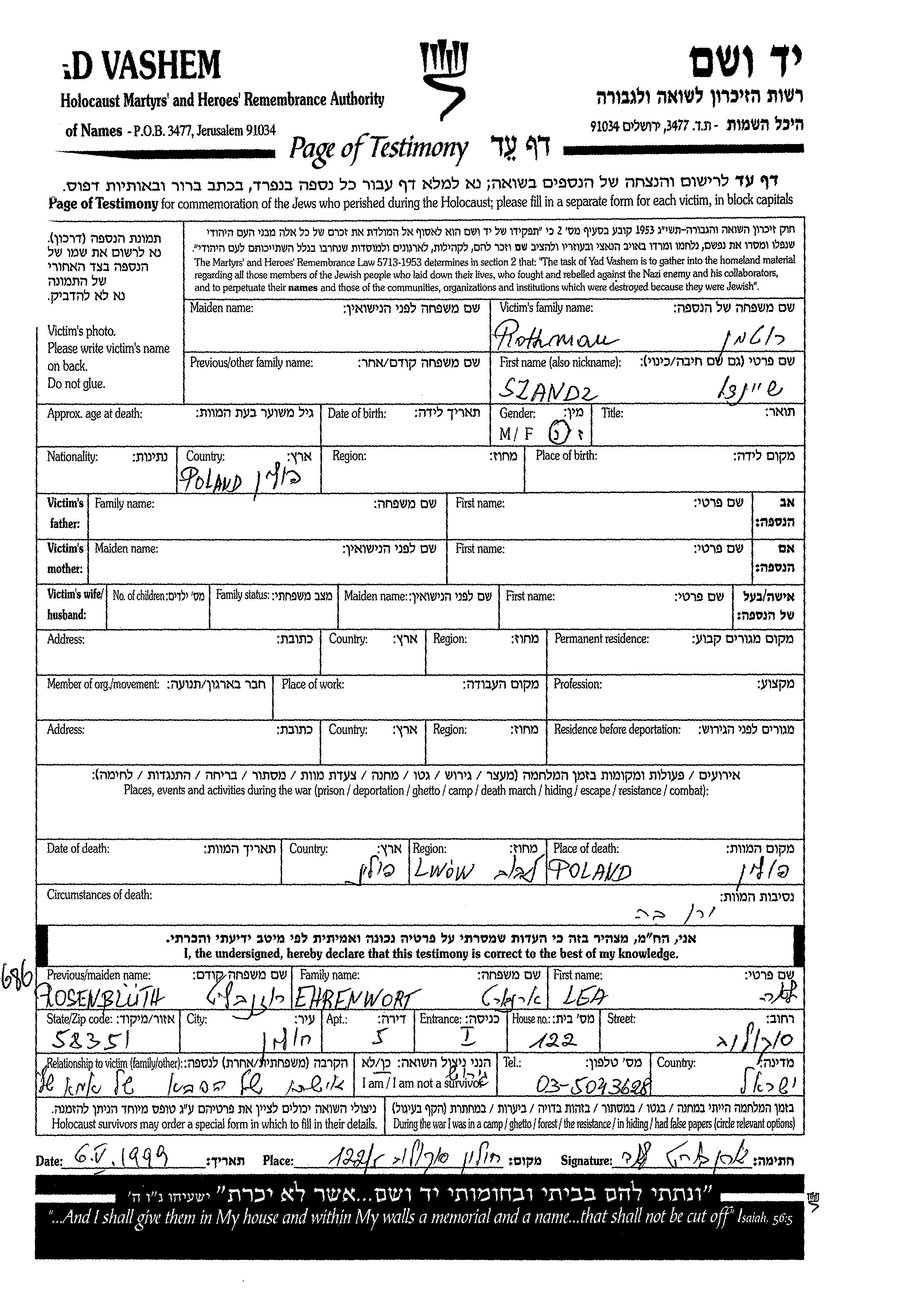 Rothman Szandl endroit inconnu, Feuille de témoignage
