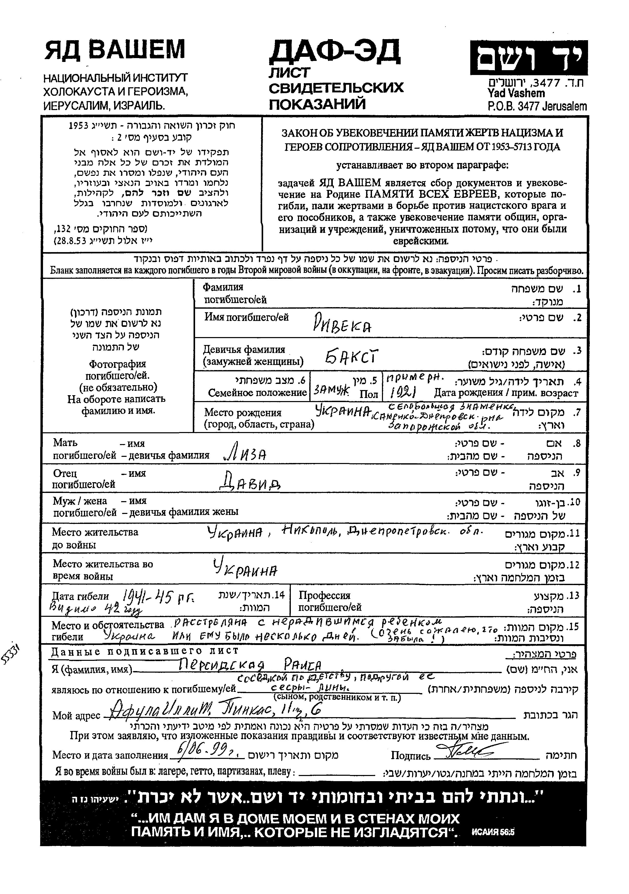 Riveka nom inconnu née Bakst est née à Bolshaya Znamenka, Ukraine (URSS) en 1921, fille de David et de Liza. Avant la seconde guerre mondiale elle vivait à Nikopol, Ukraine (URSS). Pendant la guerre, elle était à Ukraine (URSS).