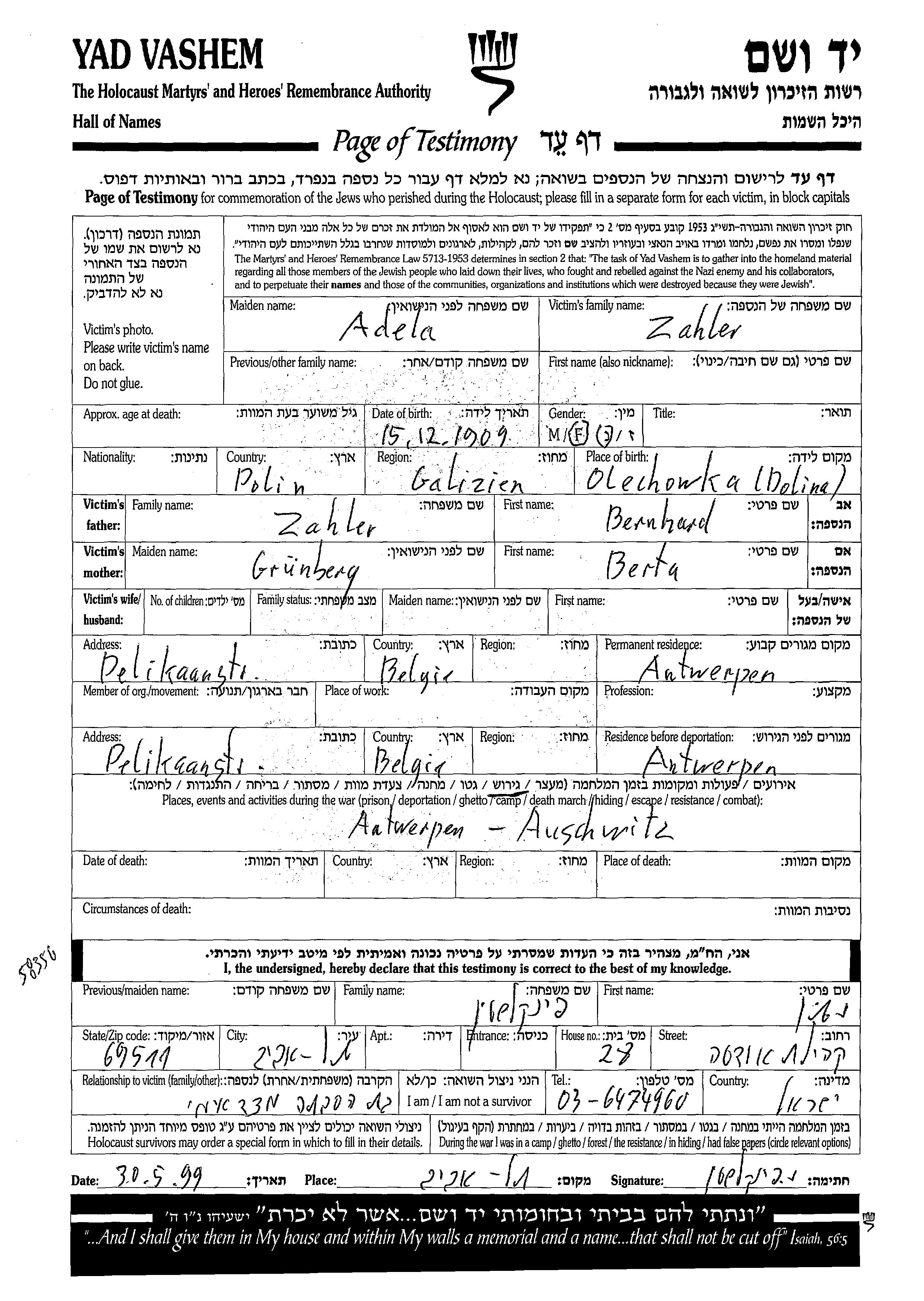 Zahler Adela 1909 Antwerpen, Belgique Feuille de témoignage