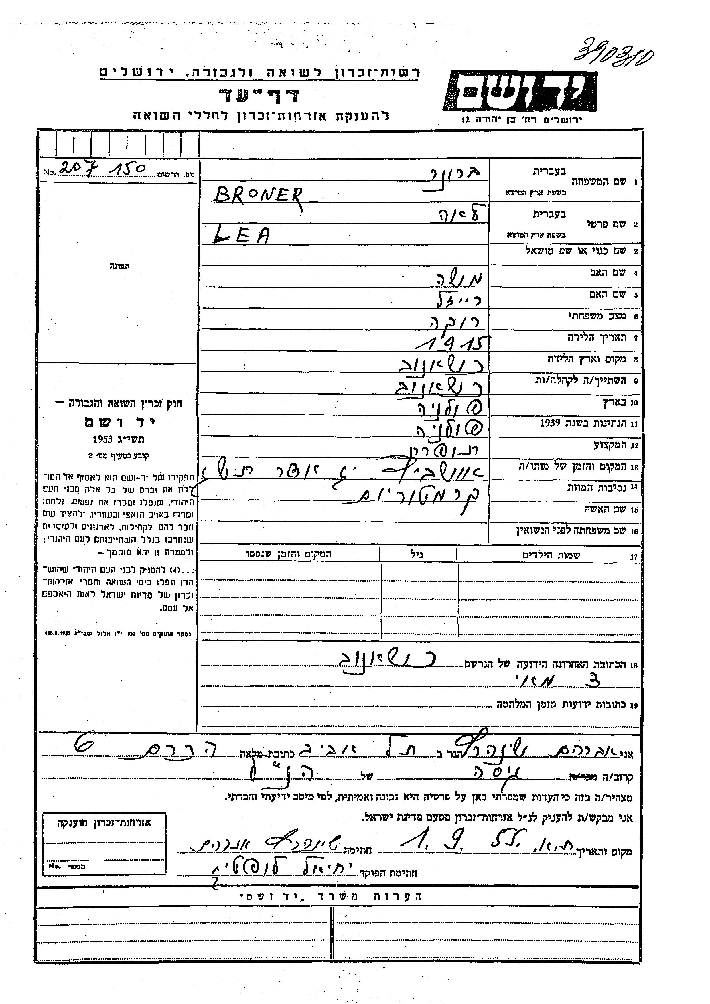 Lea Broner est née à Chszanow, Pologne en 1915, fille de Moshe et de Reizl. Elle était Couturière et Célibataire. Avant la seconde guerre mondiale elle vivait à Chszanow, Pologne. Pendant la guerre, elle était à Chszanow, Pologne.