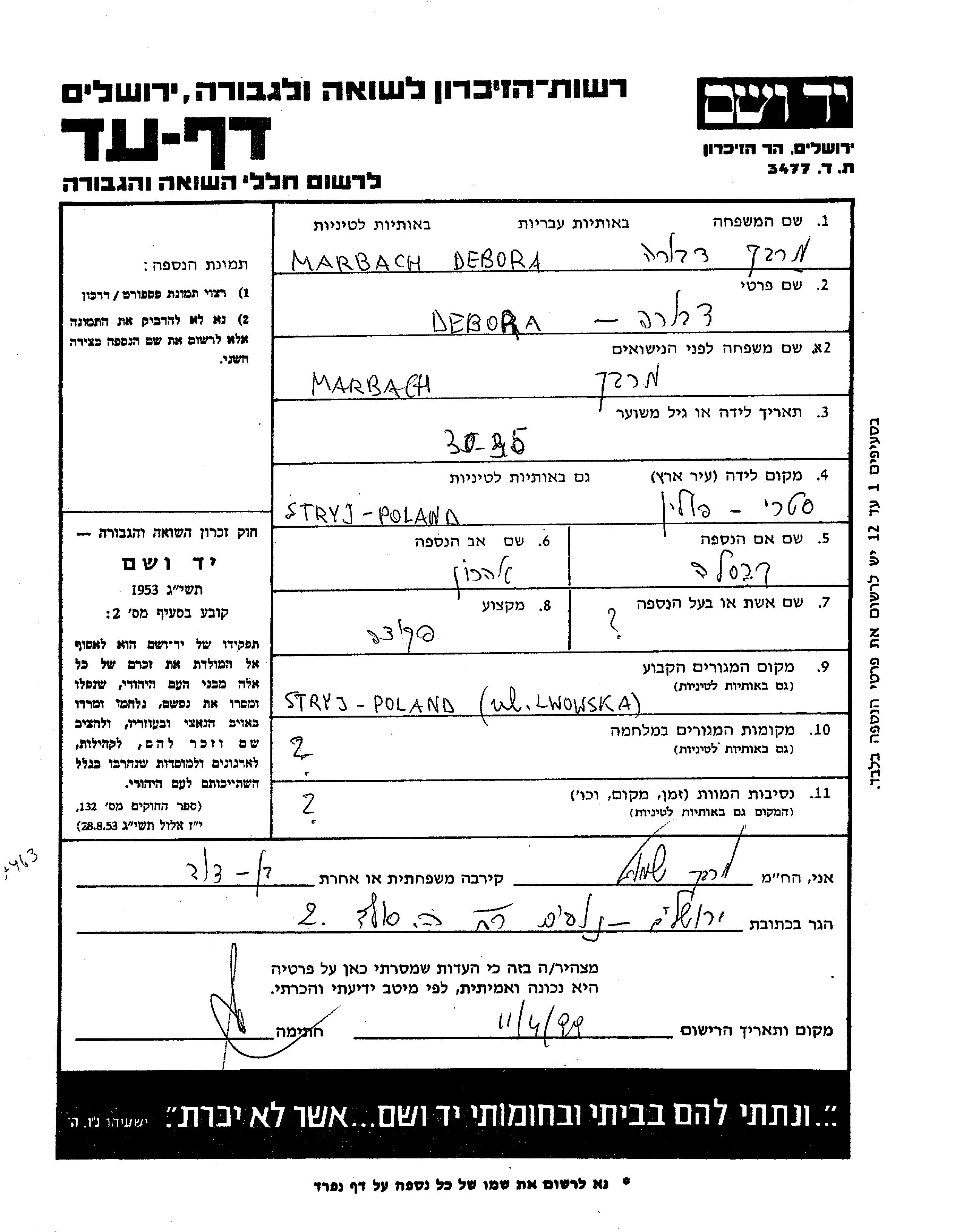 Marbach Debora Stryj, Pologne Feuille de témoignage