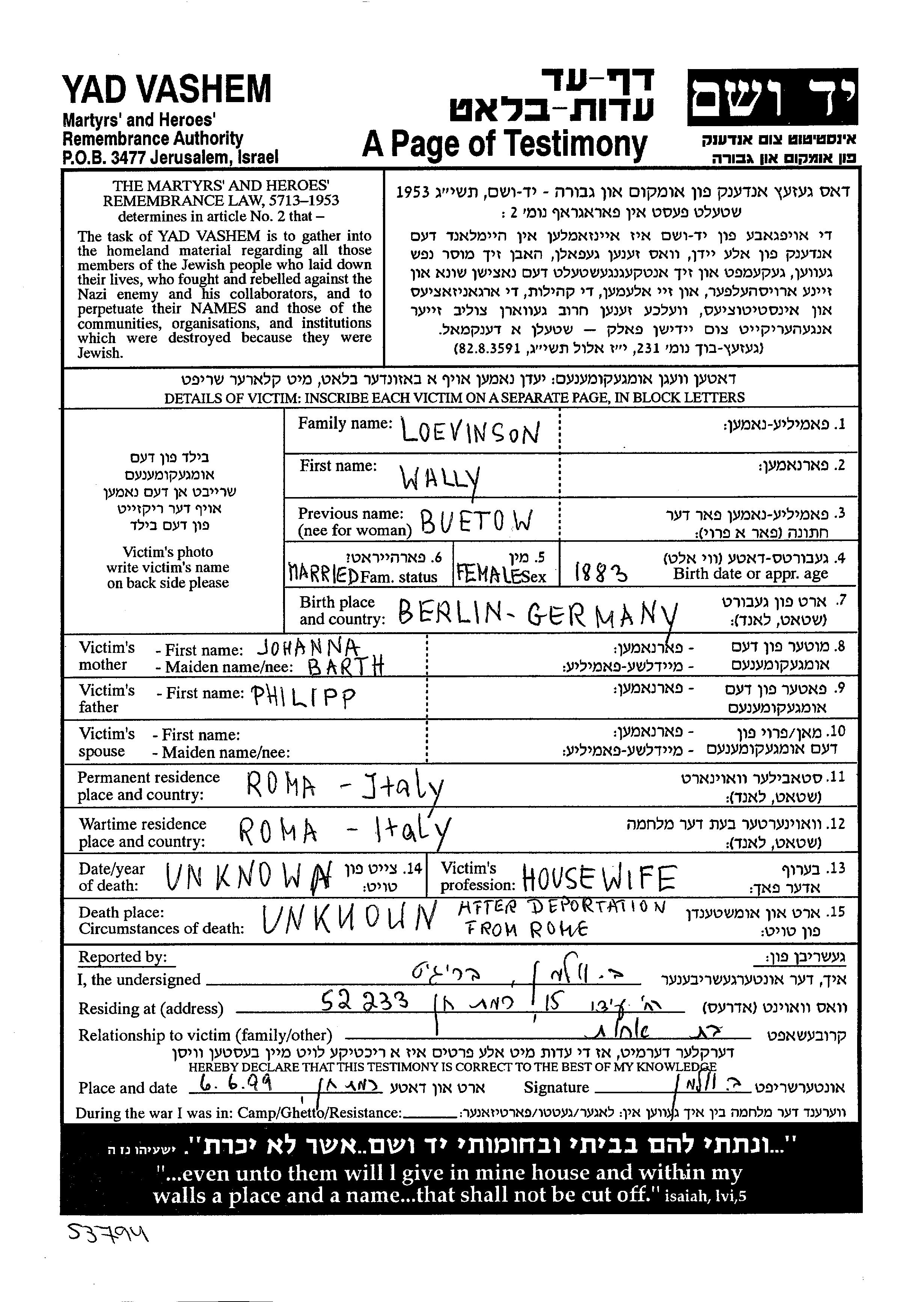 Wally Loevinson née Buetow est née à Berlin, Allemagne en 1883, fille de Philipp et de Johanna. Elle était Mariée. Avant la seconde guerre mondiale elle vivait à Roma, Italie. Pendant la guerre, elle était à Roma, Italie.
