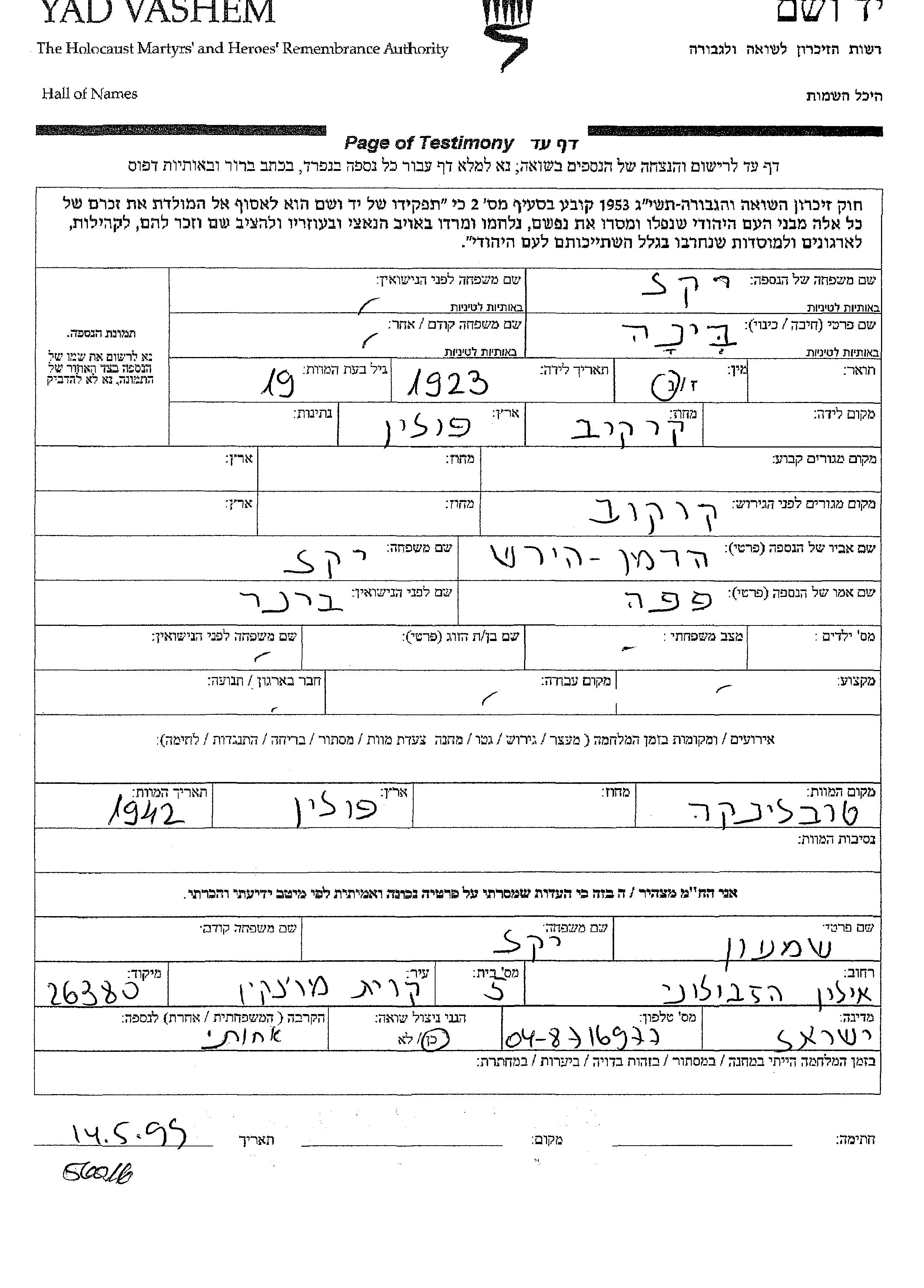 Iekel | Bina | 1923 | endroit inconnu, | Feuille de témoignage |